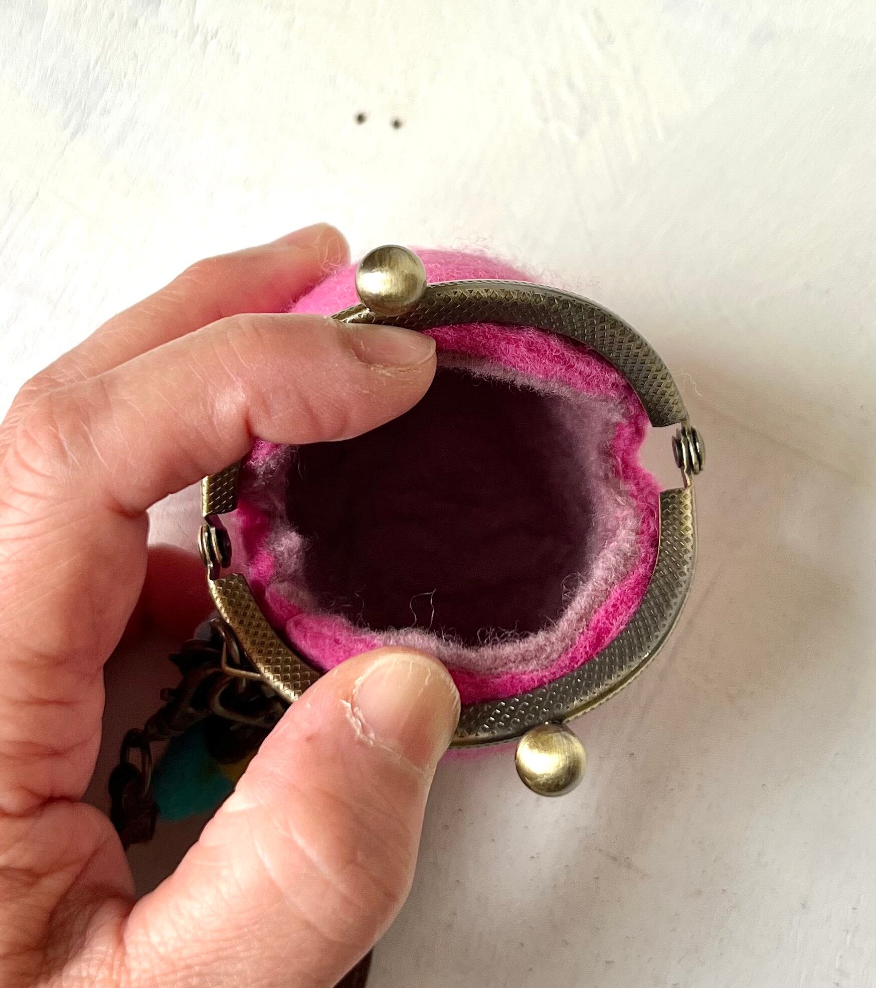 手のひらサイズの球体の羊毛フエルトがま口で、バックの外付けができるタイプです。