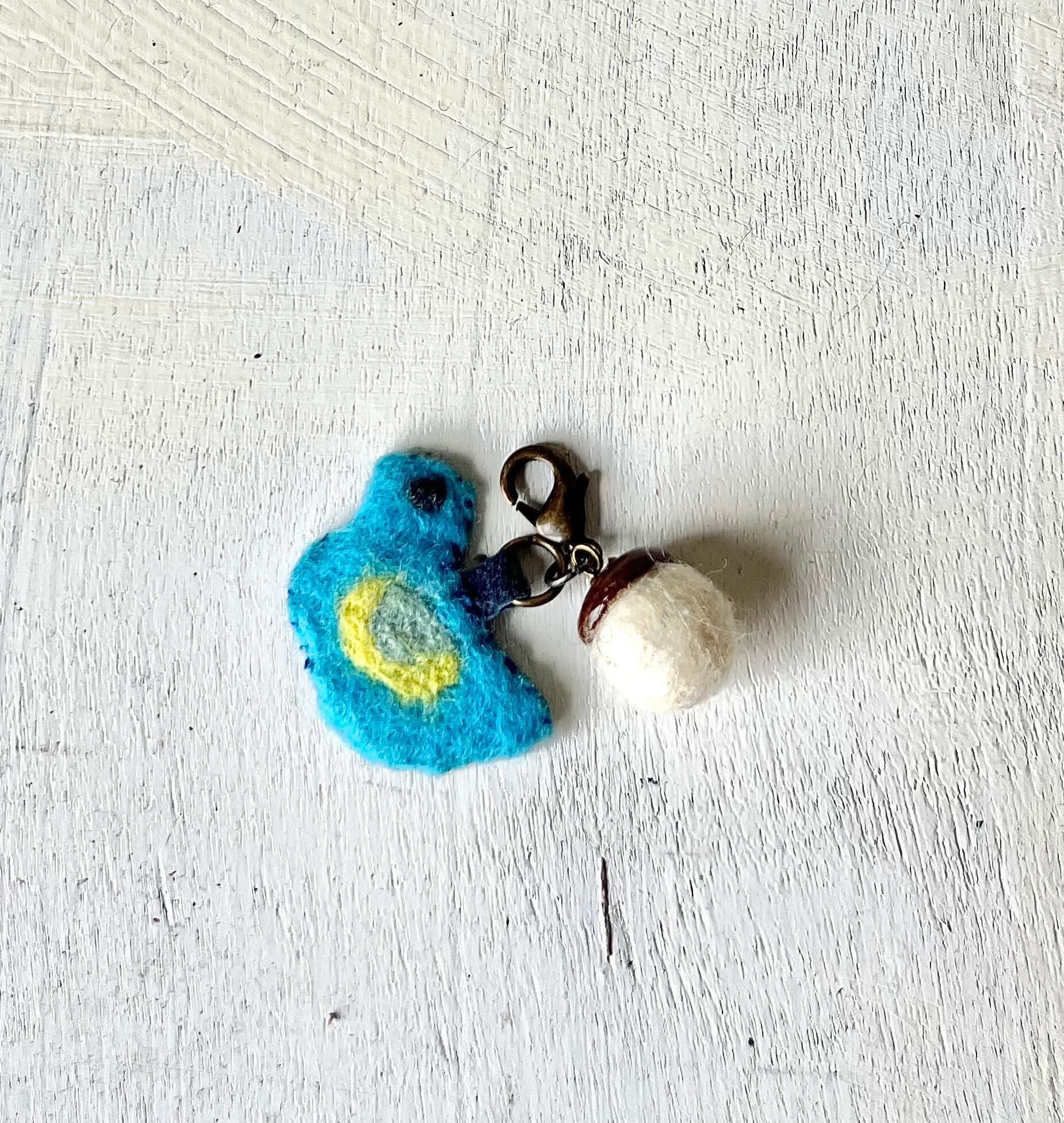 ポーチ本体は100%羊毛、チャームの小鳥、ドングリも羊毛です。