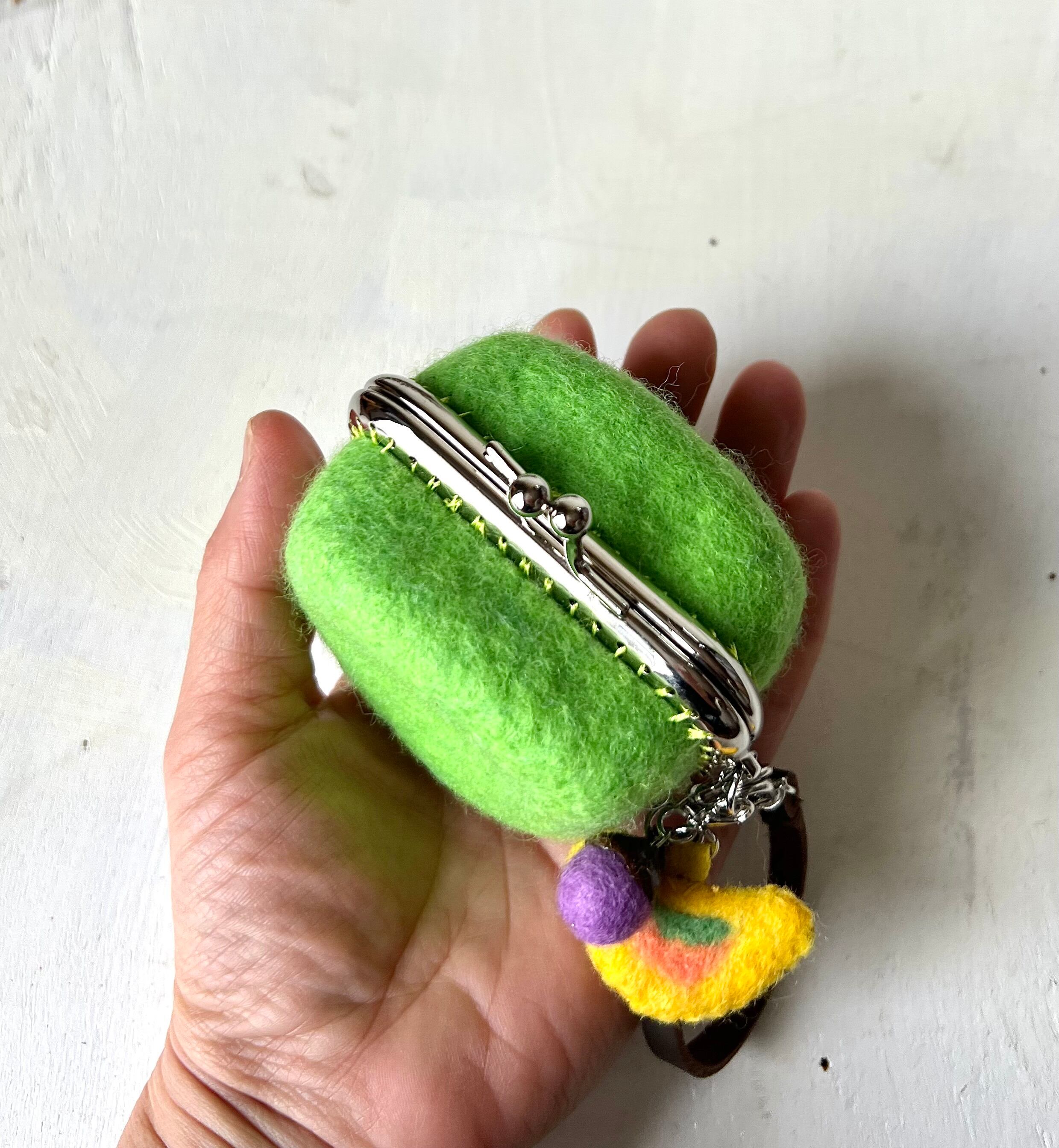 手のひらサイズの球体の羊毛フエルトがま口で、バックの外付けができるタイプです。