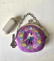 可愛らしいお花のリースと小鳥の刺繍が施されたま口が、目を引くアイテムです。