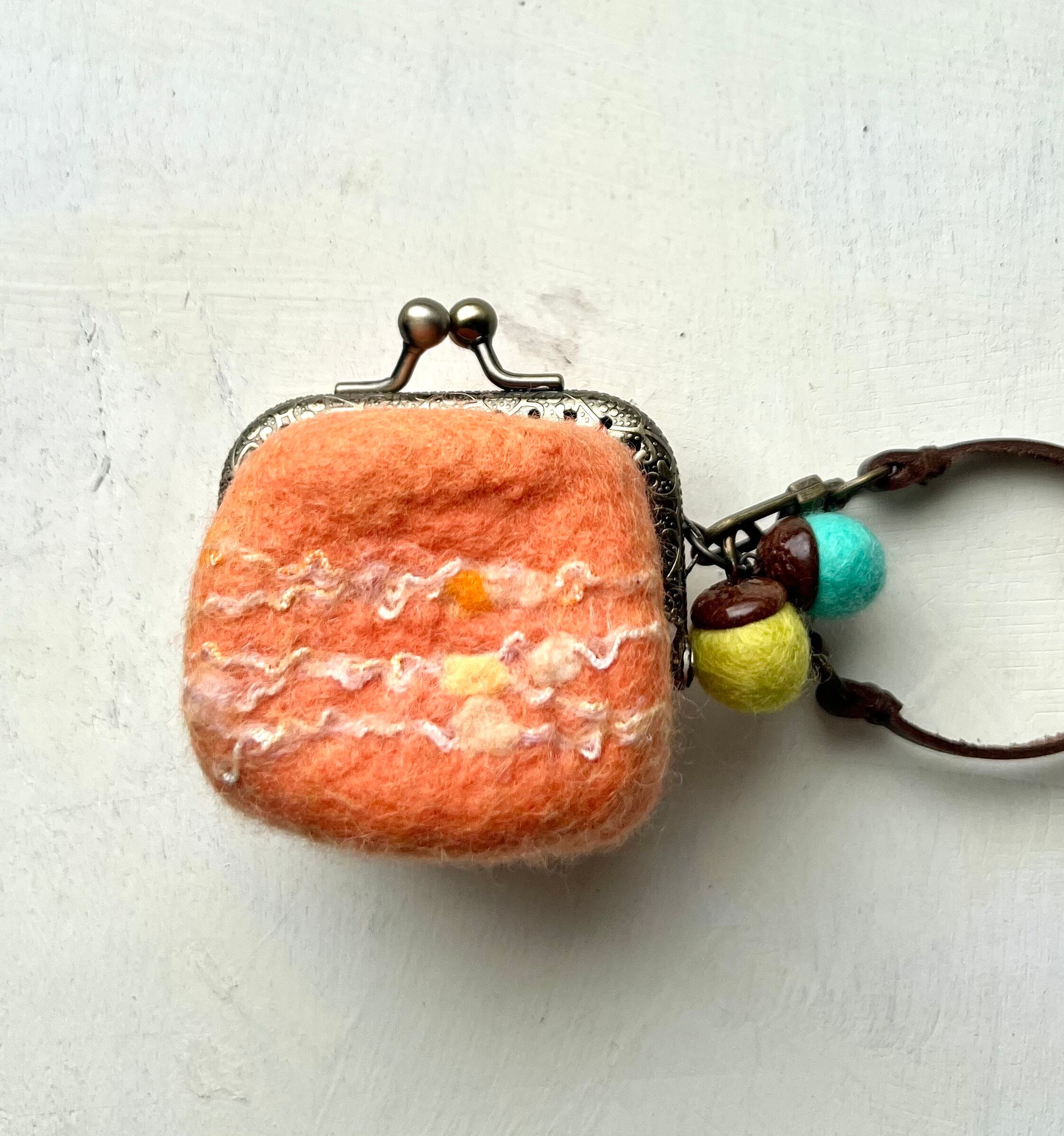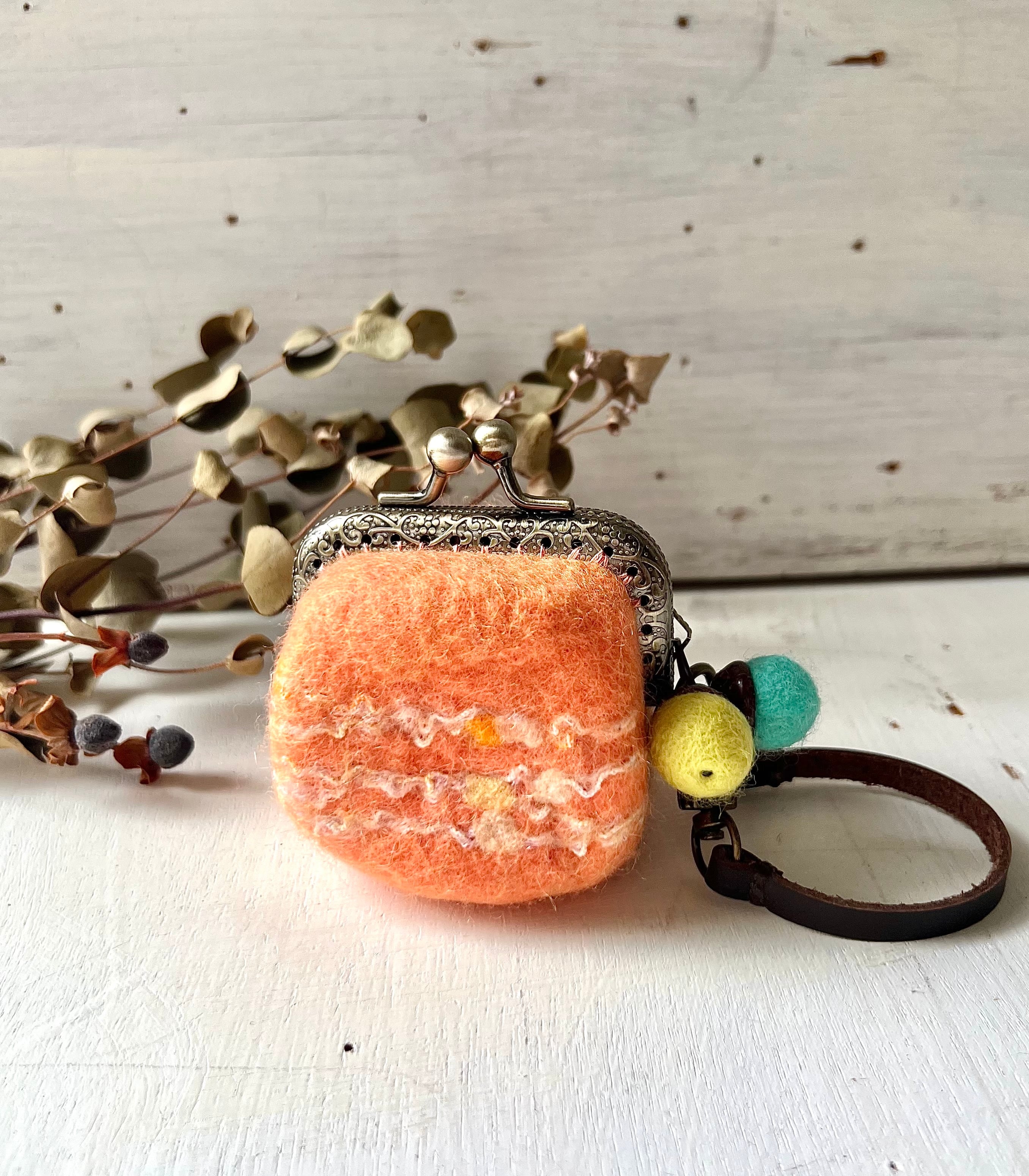 手のひらサイズの球体の羊毛フエルトがま口で、バックの外付けができるタイプです。