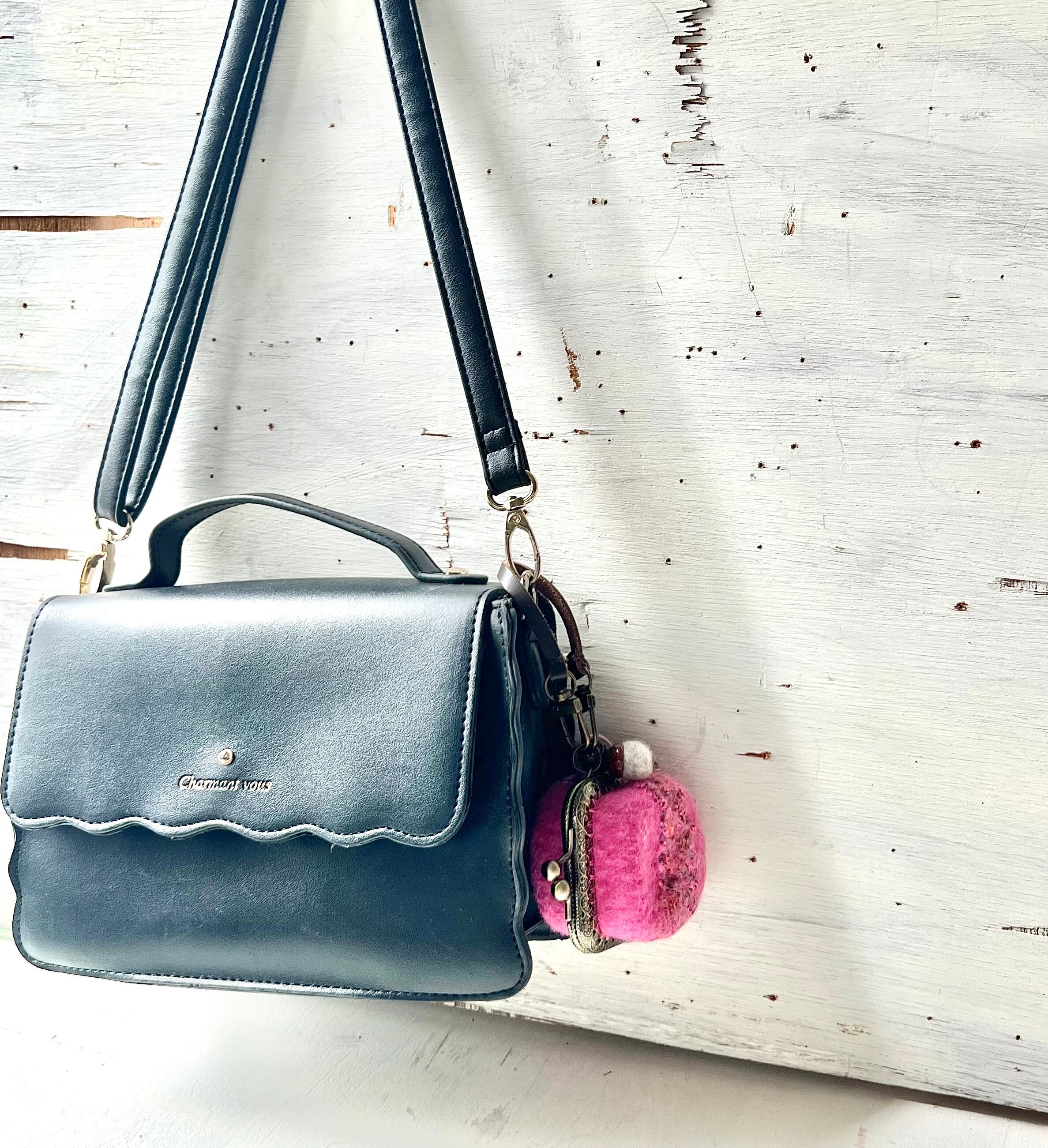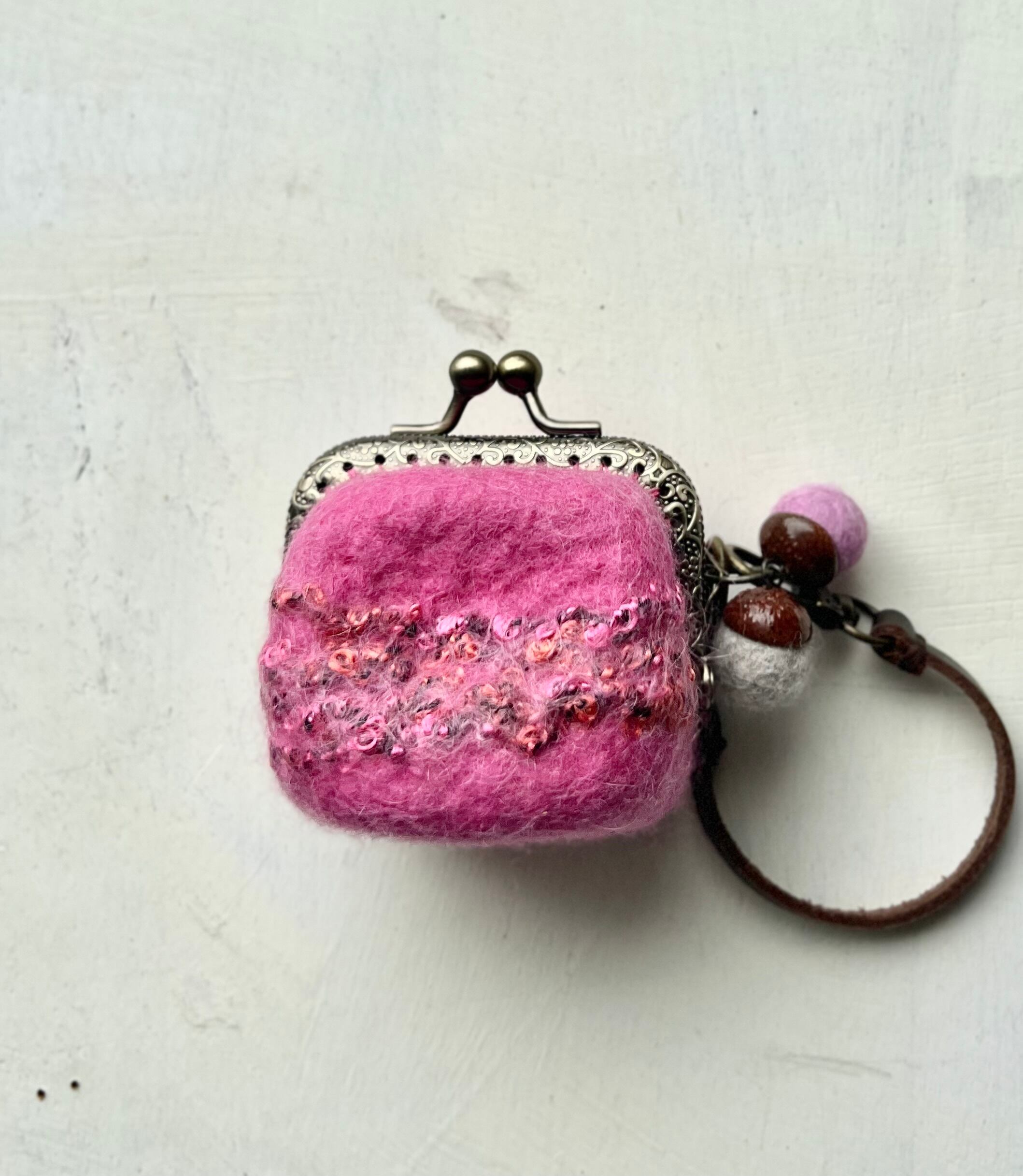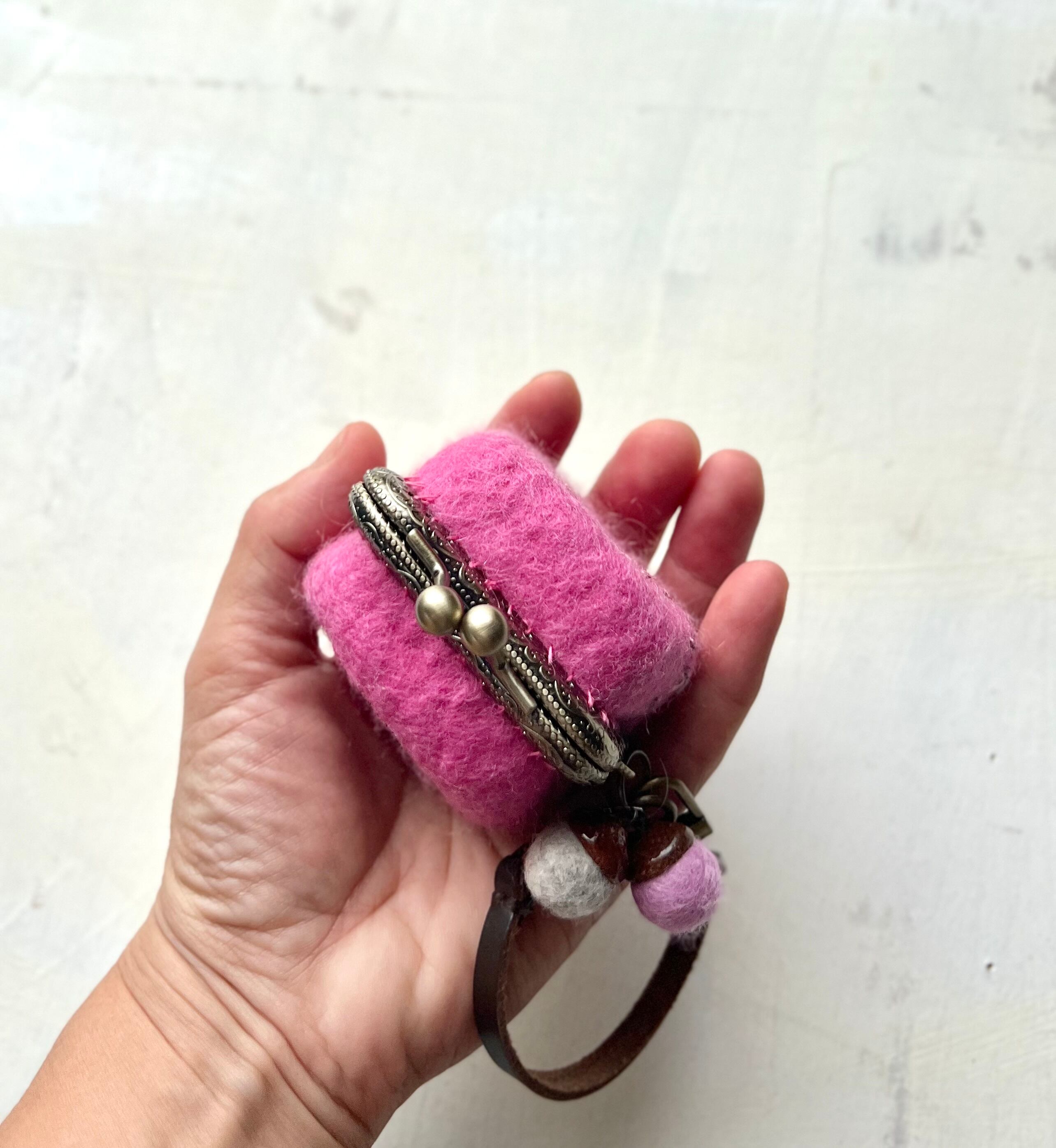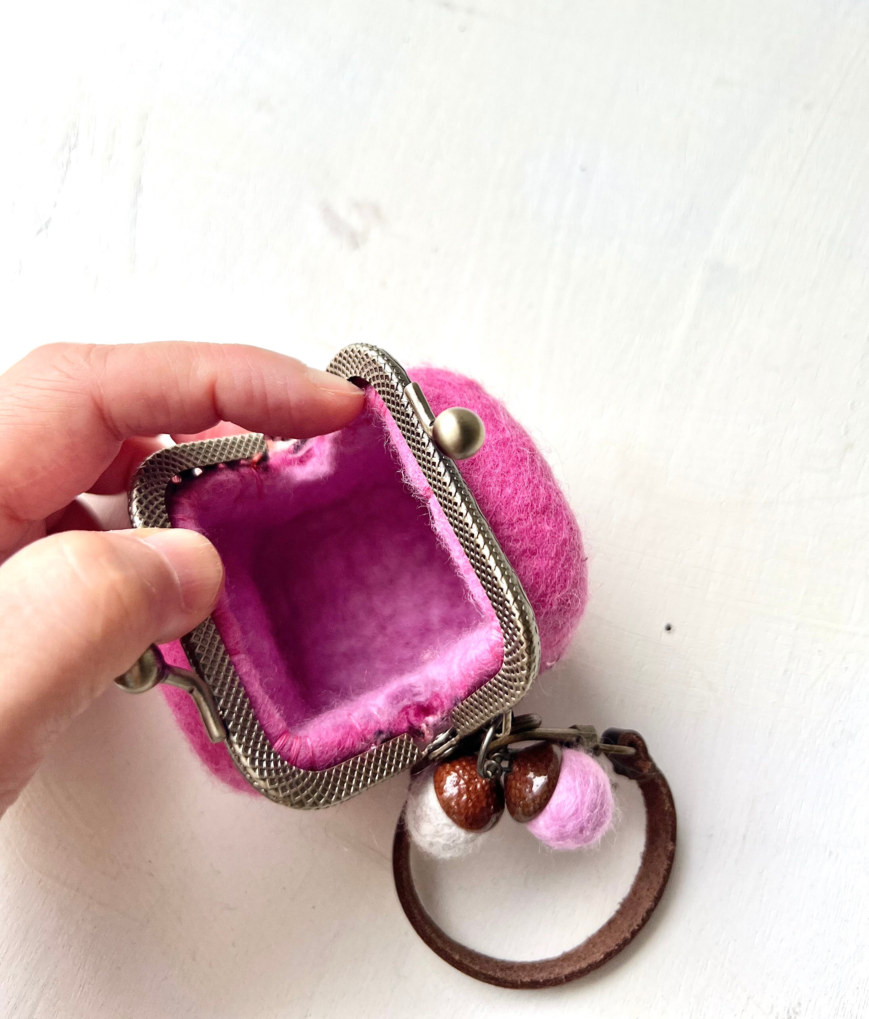 手のひらサイズの球体の羊毛フエルトがま口で、バックの外付けができるタイプです。