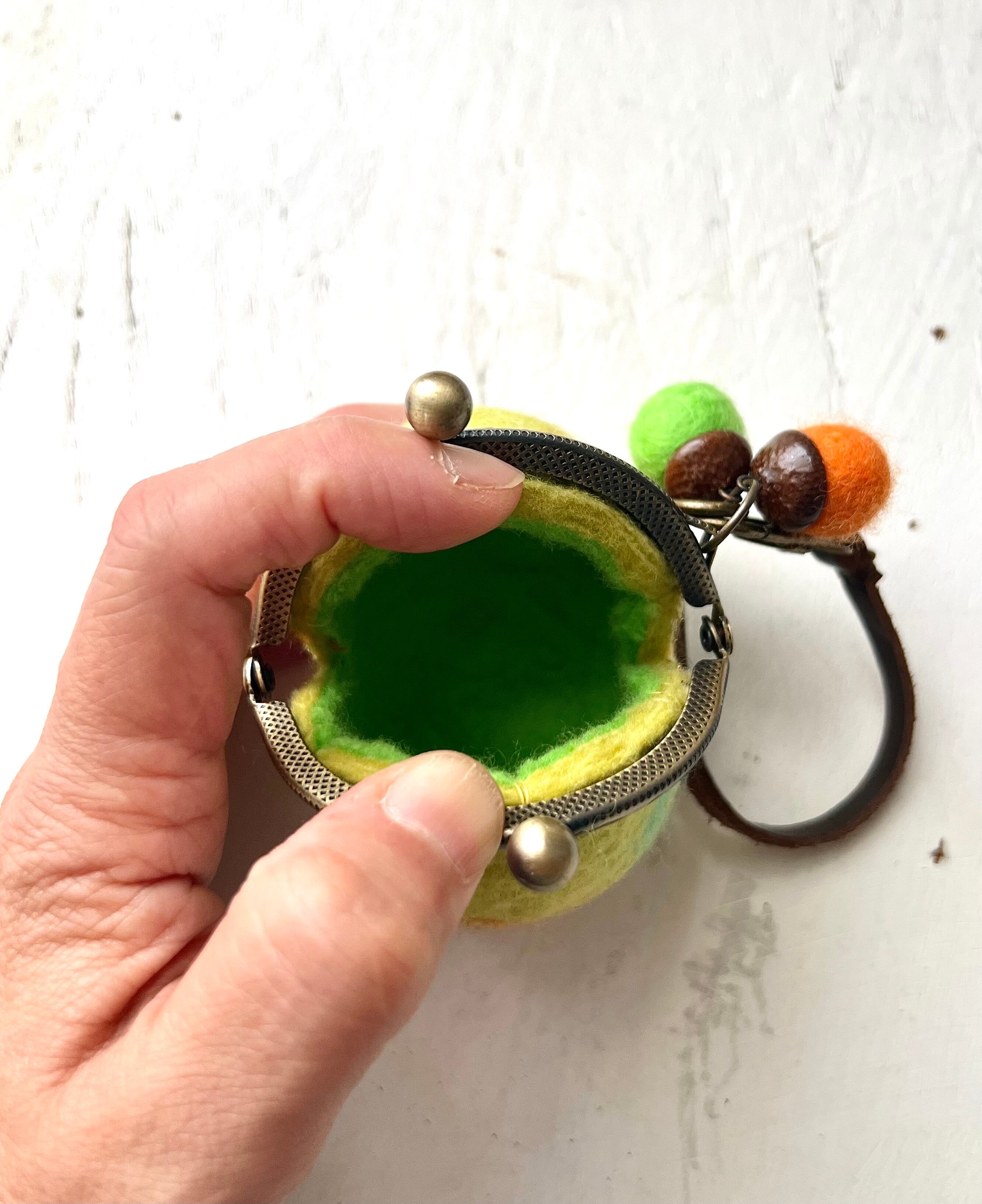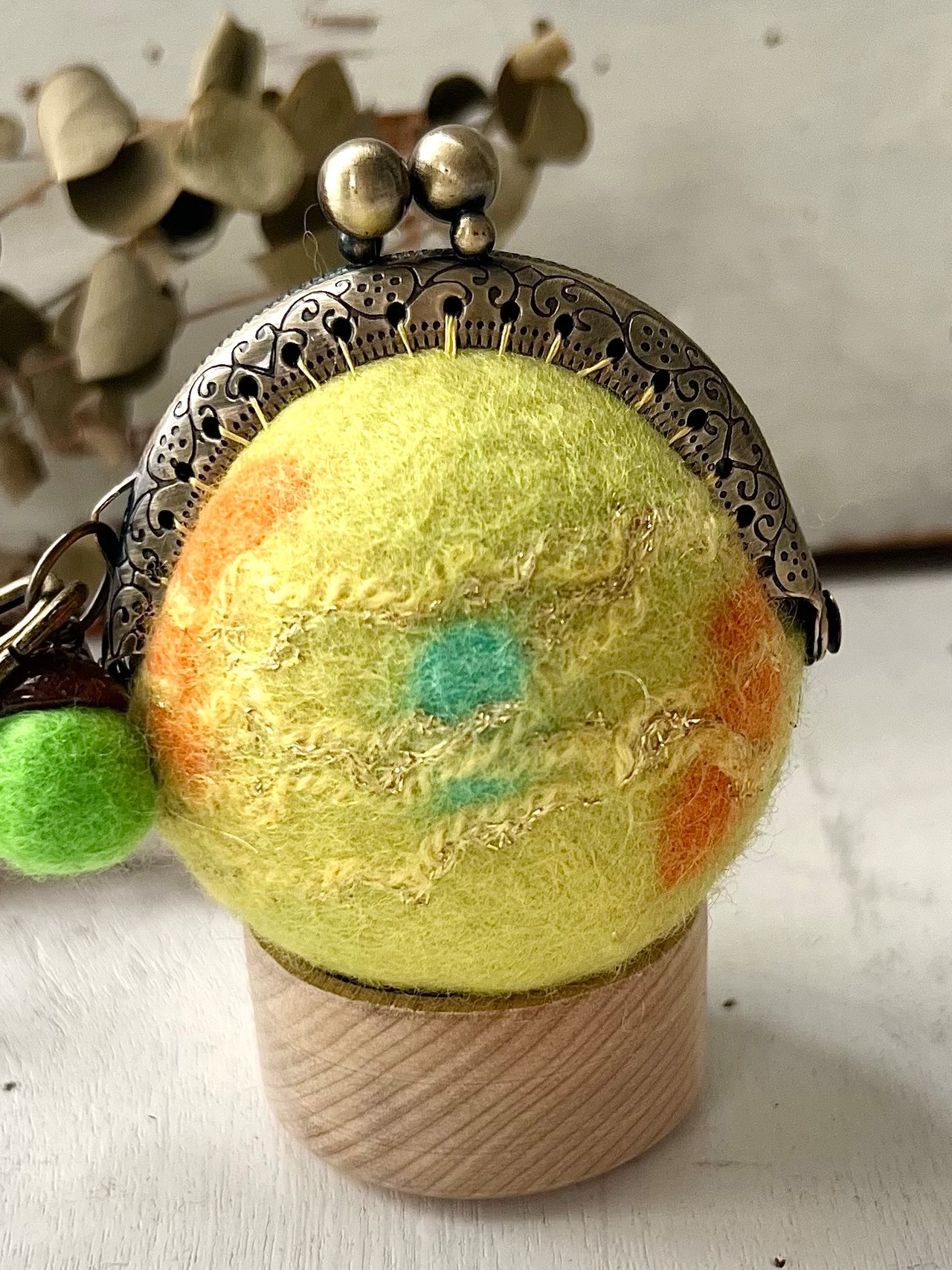 手のひらサイズの球体の羊毛フエルトがま口で、バックの外付けができるタイプです。