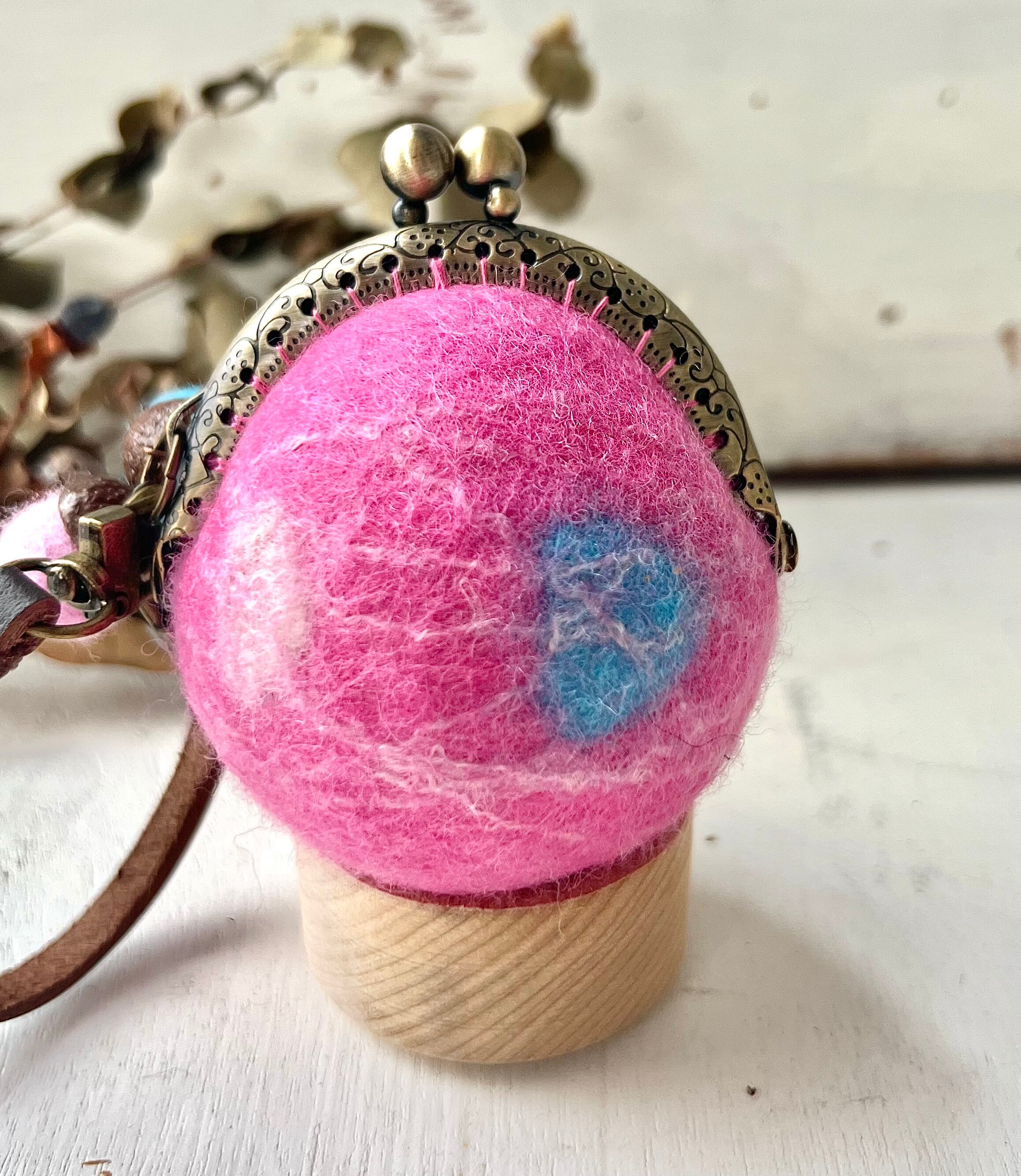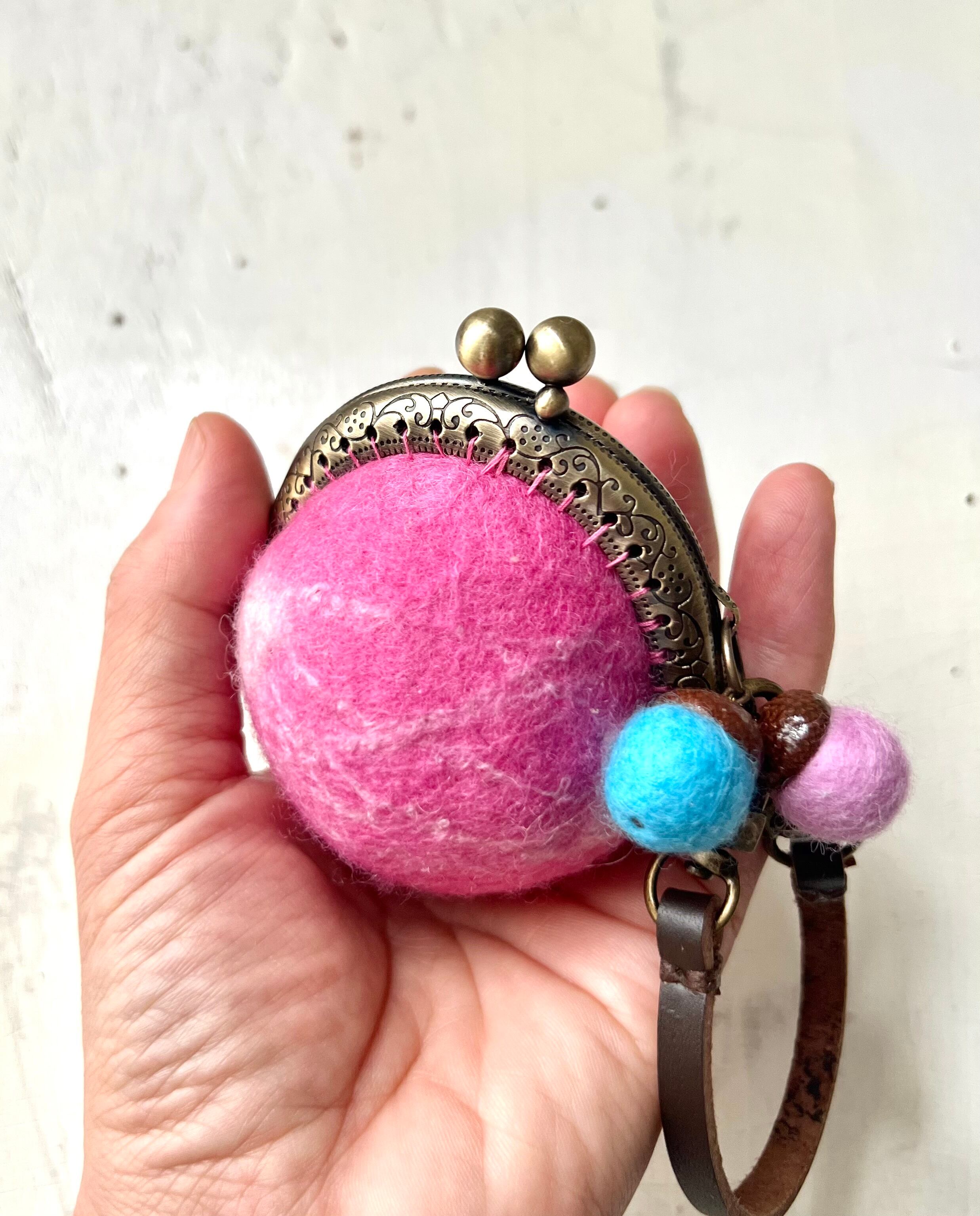 手のひらサイズの球体の羊毛フエルトがま口で、バックの外付けができるタイプです。