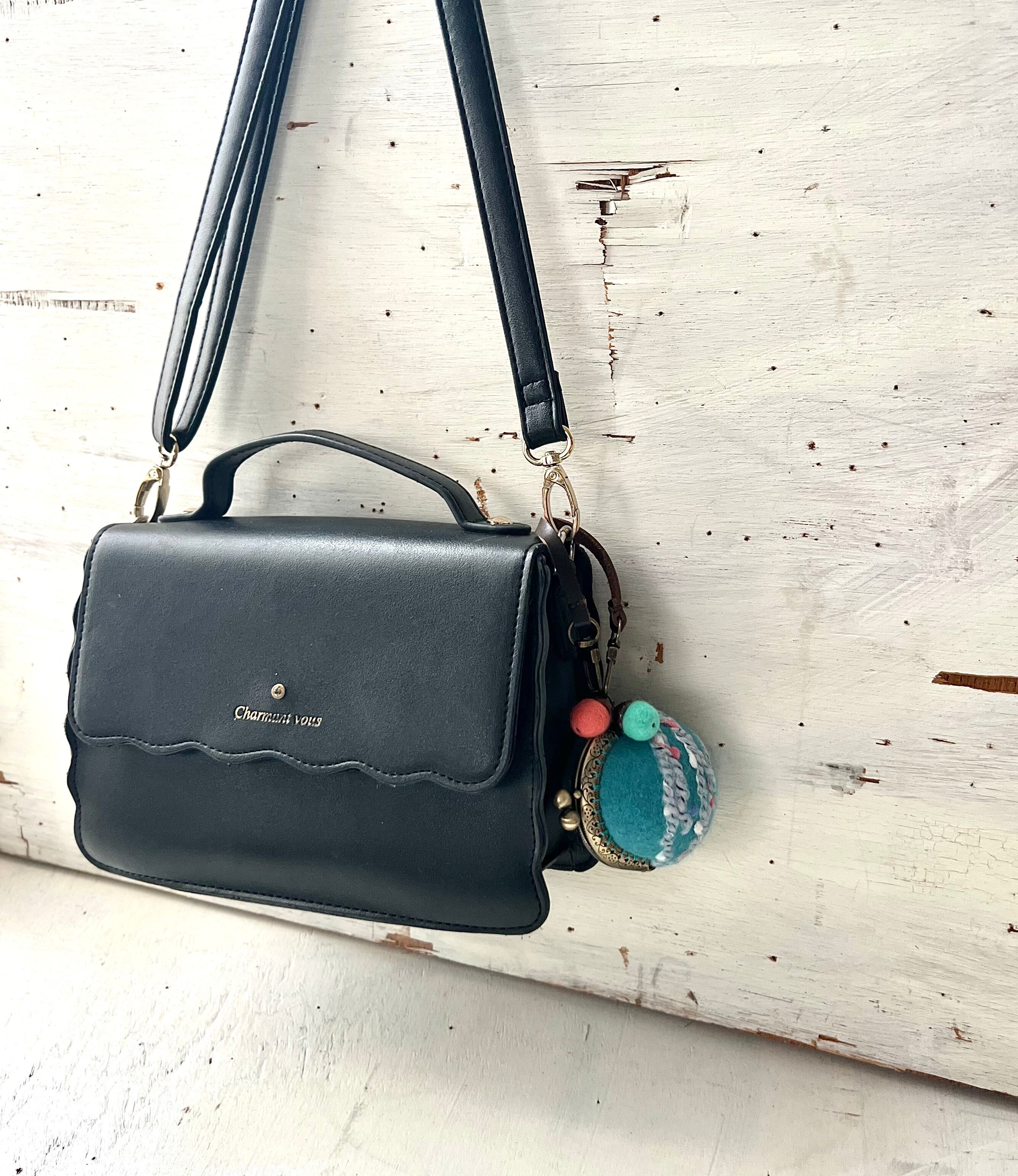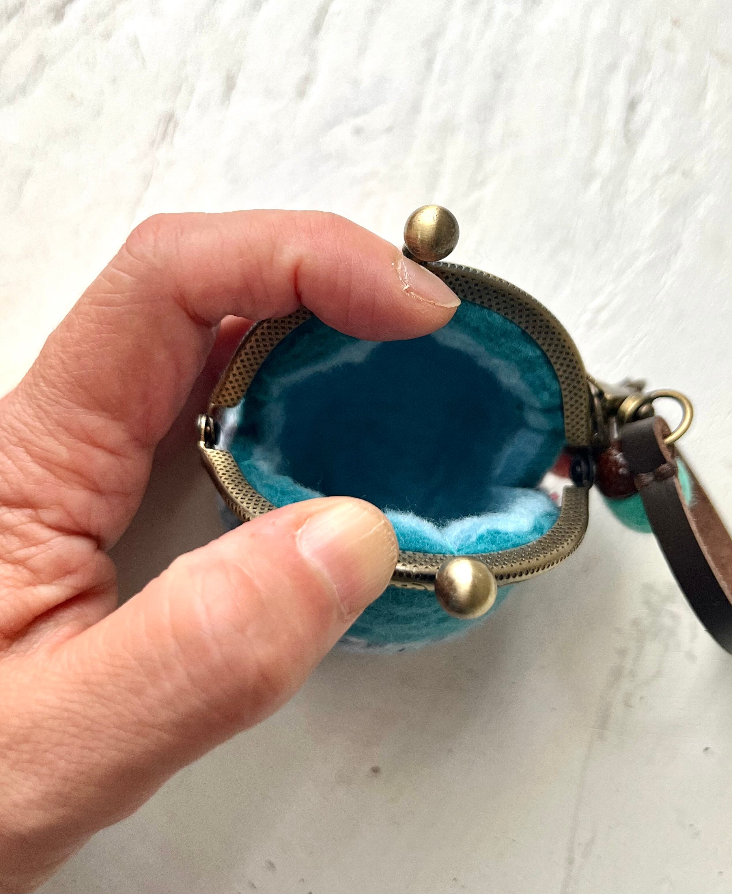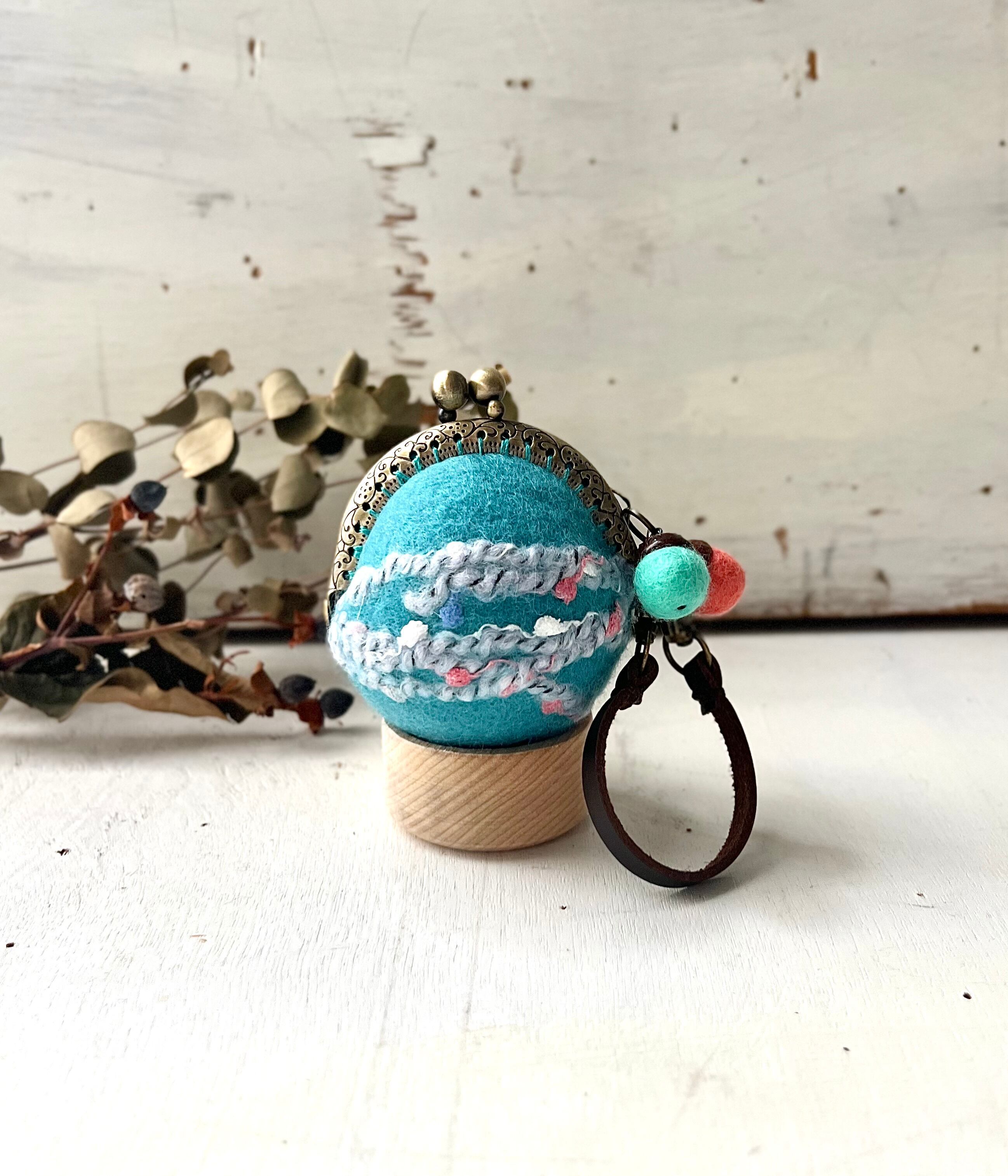 手のひらサイズの球体の羊毛フエルトがま口で、バックの外付けができるタイプです。