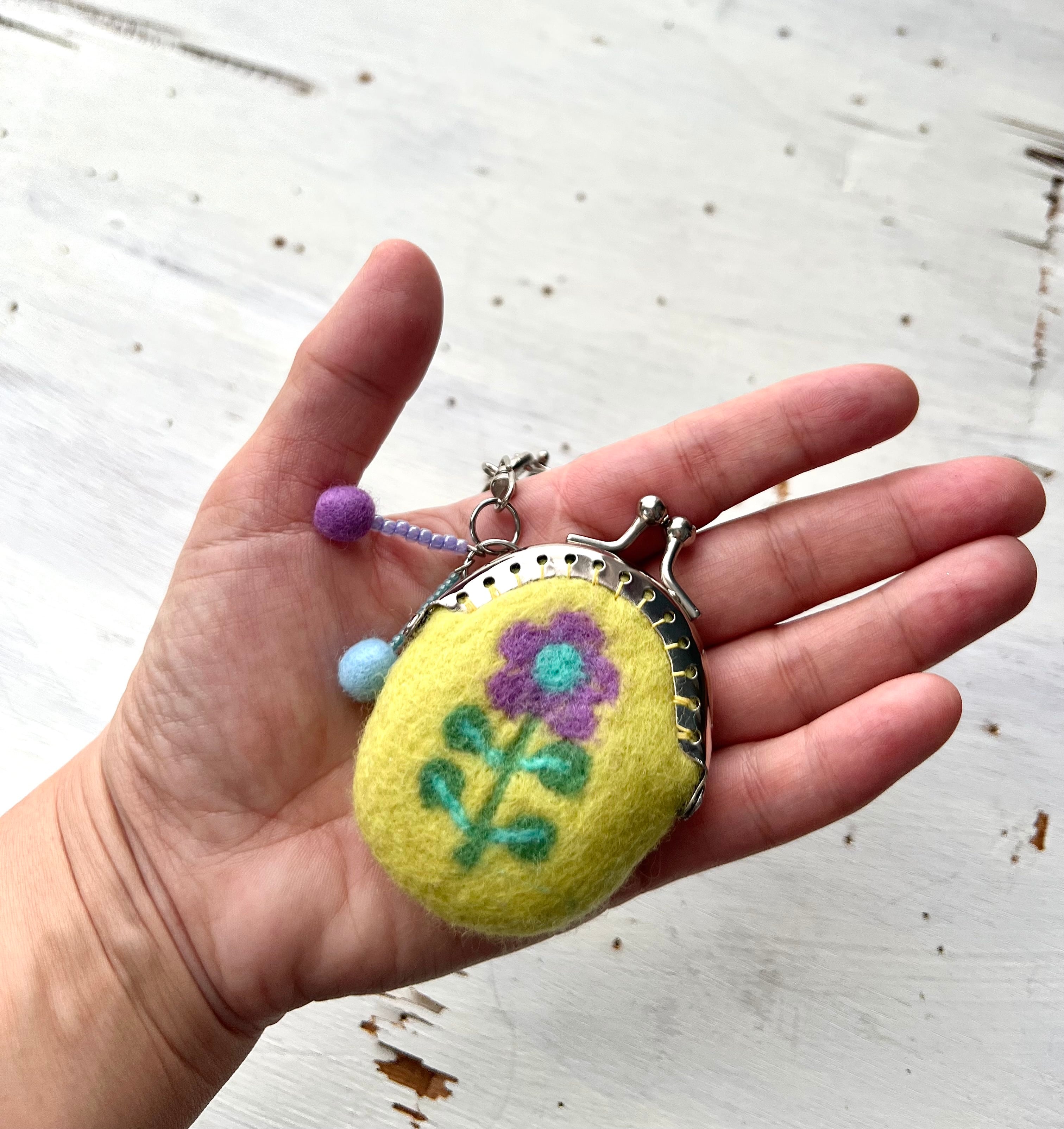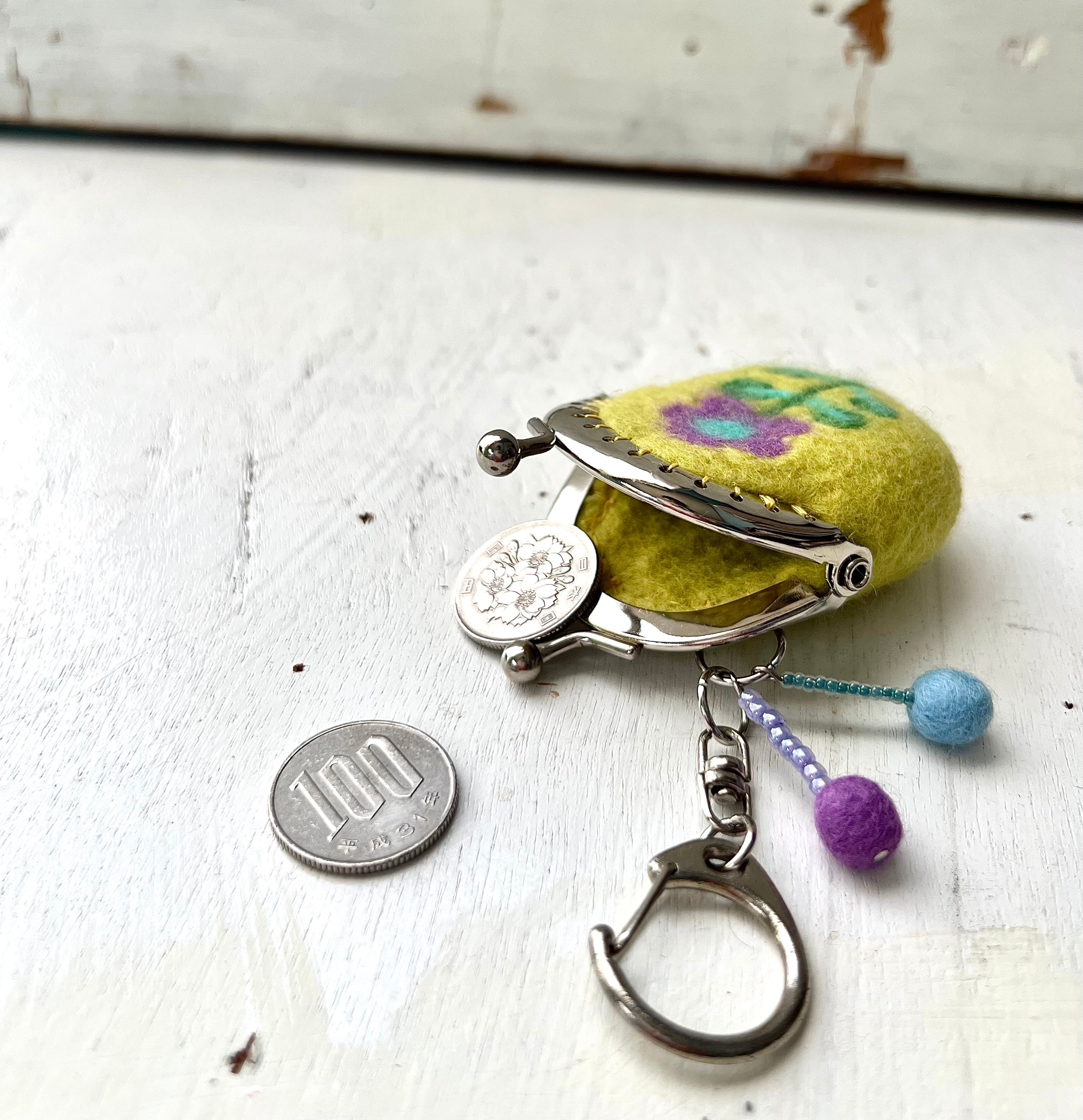 花の羊毛刺繍ミニミニがま口(山吹)