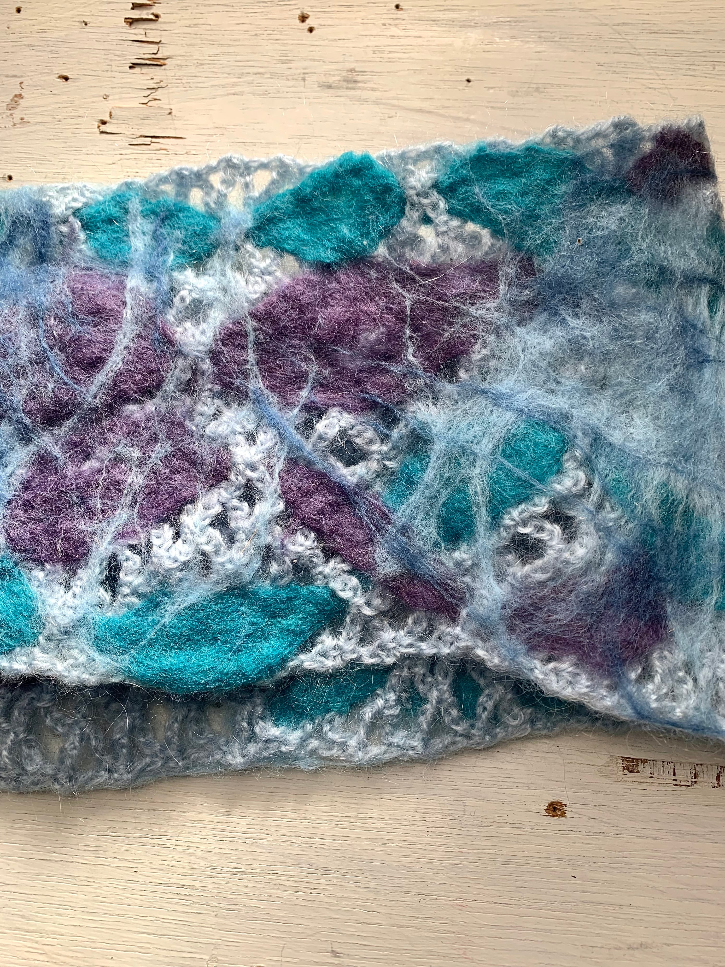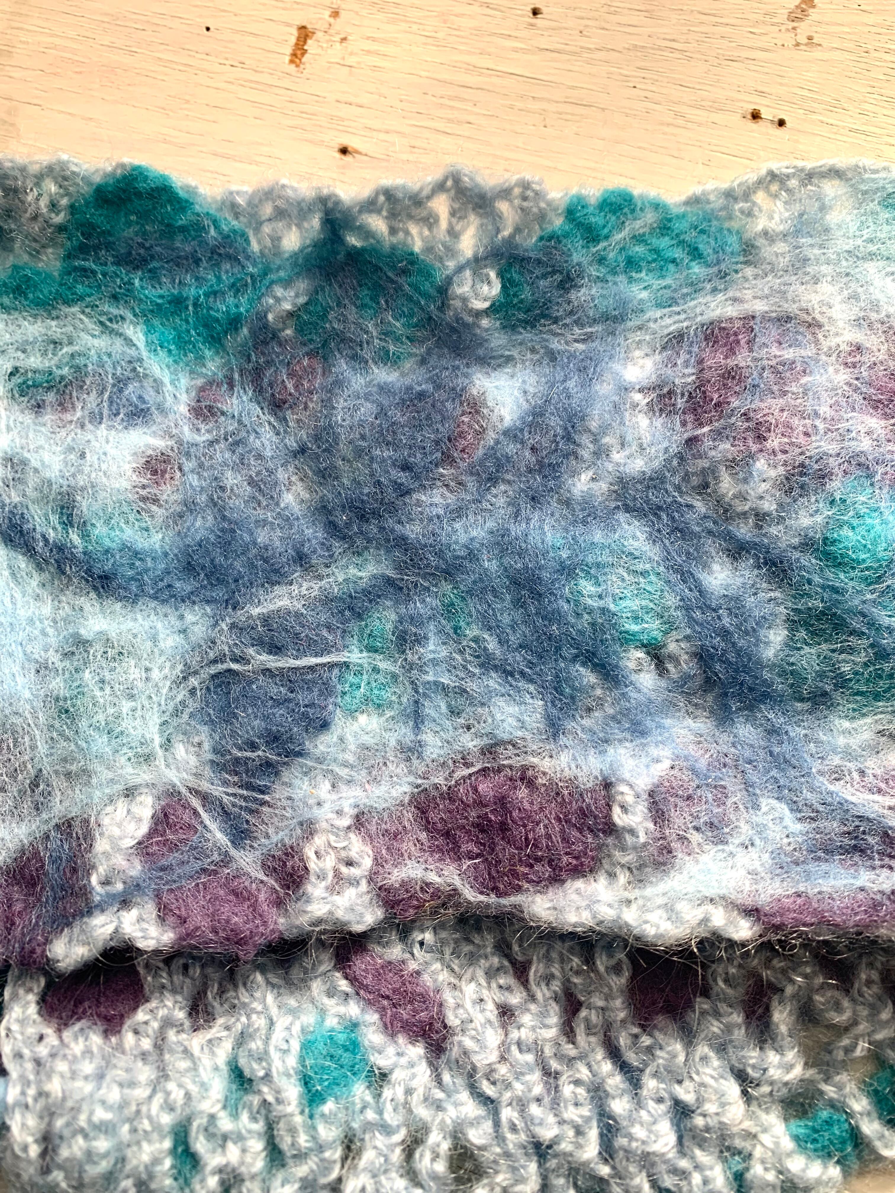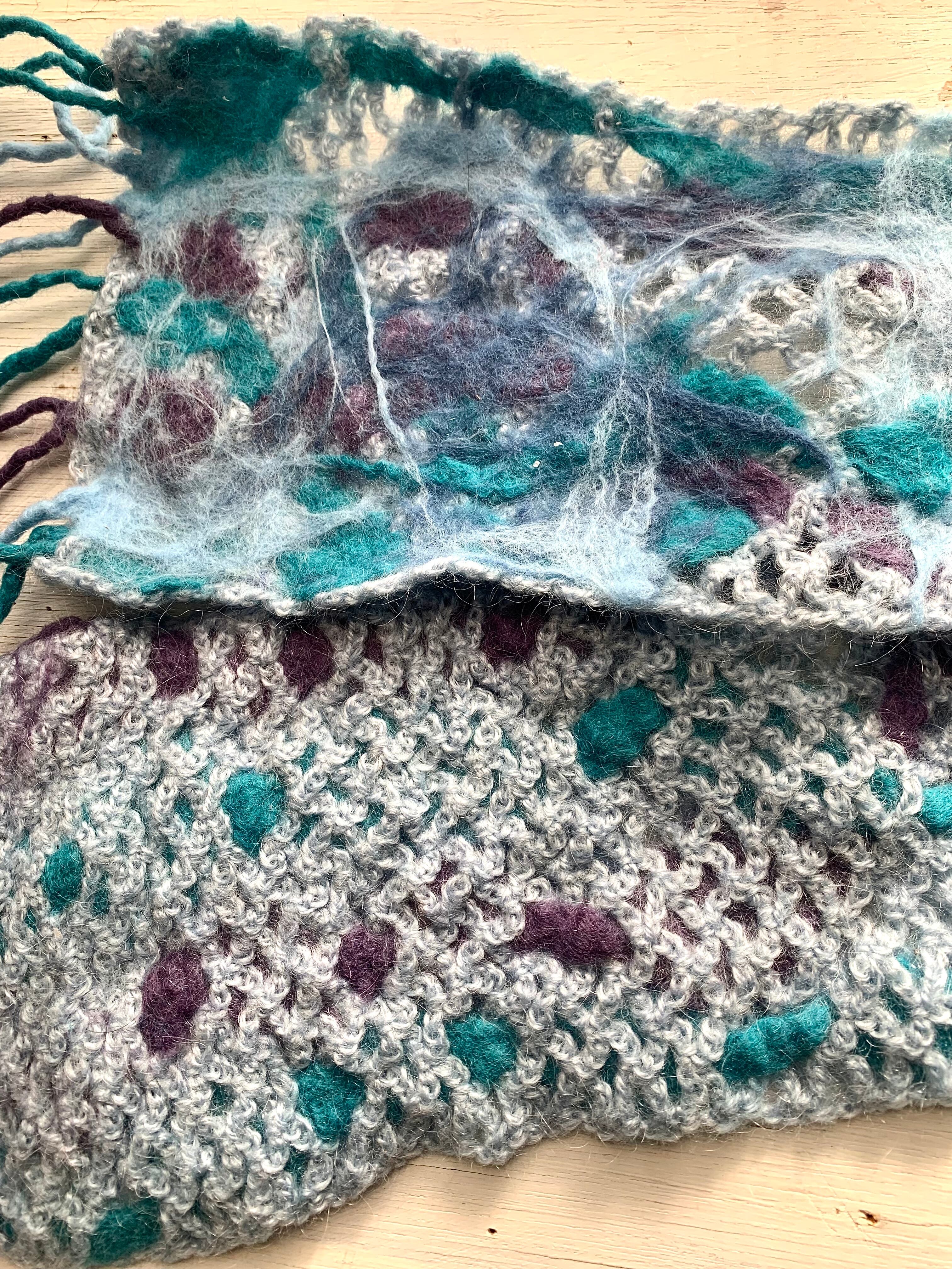 鍵編みの毛糸マフラーに羊毛を絡めてフェルト化している為、毛糸マフラーと一体化しています。