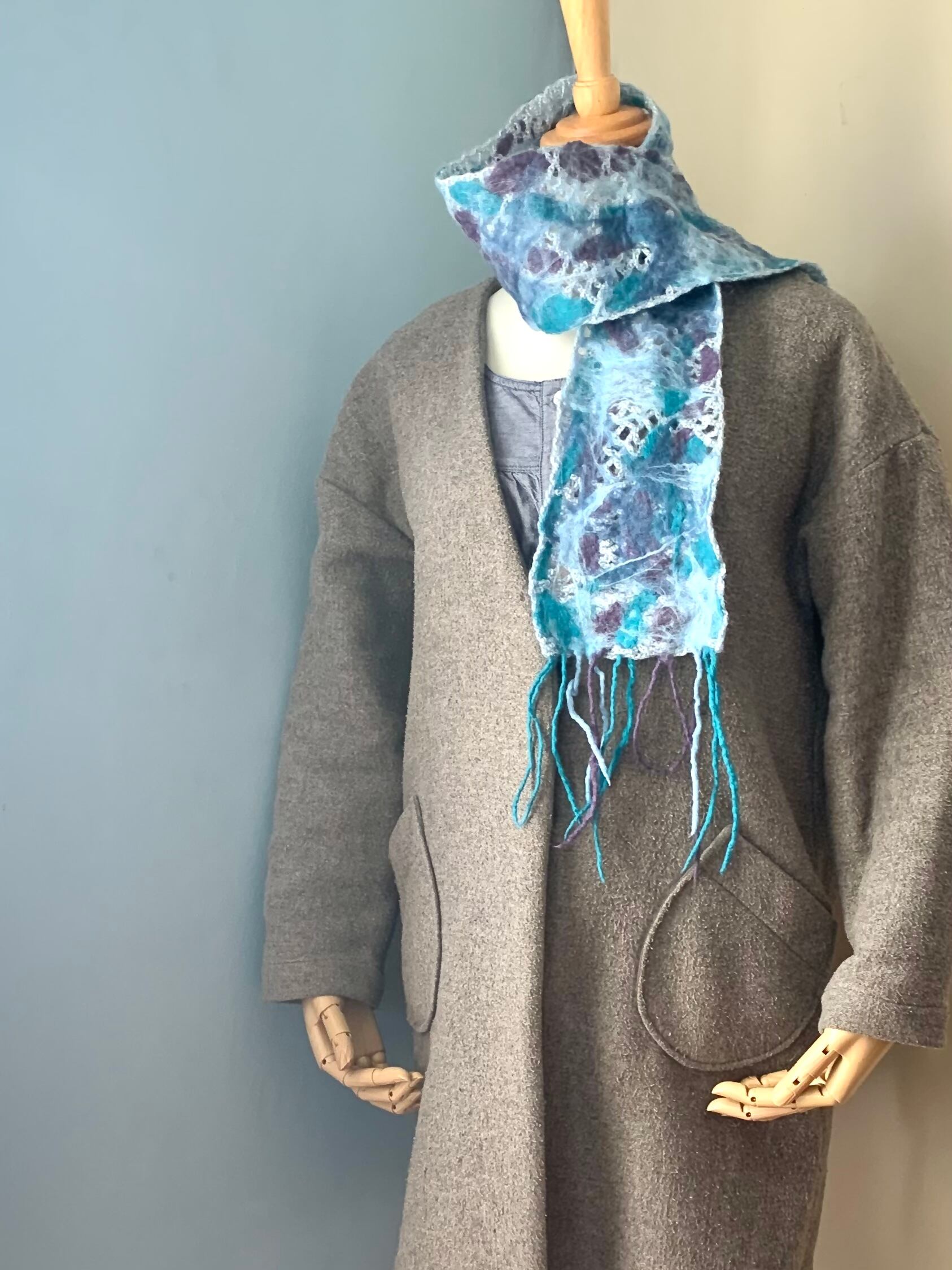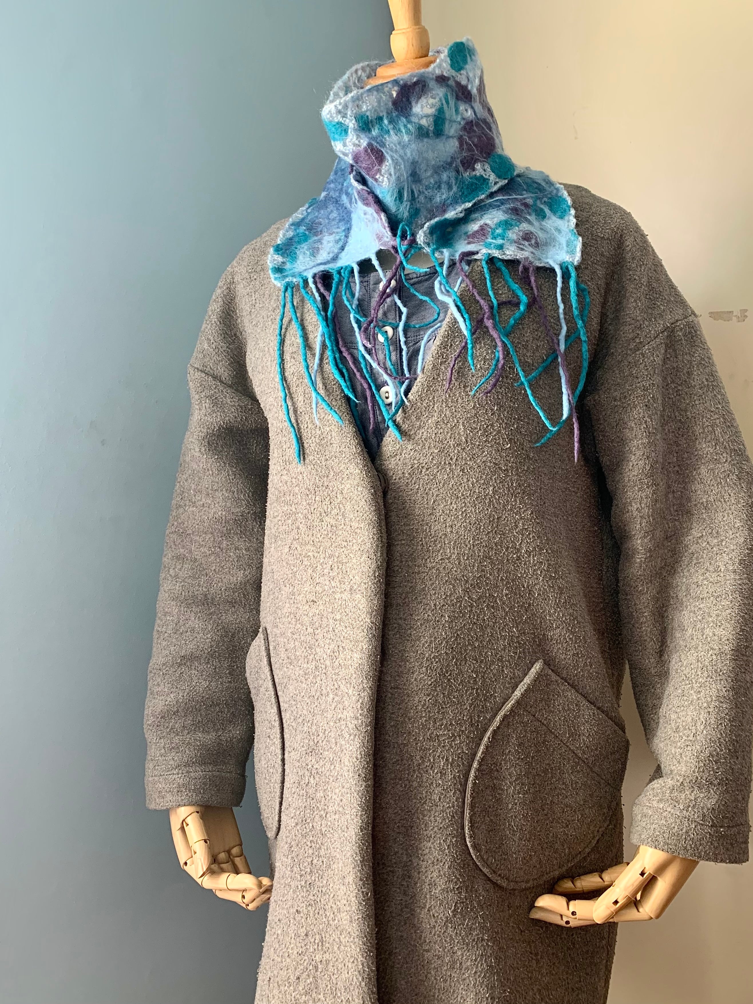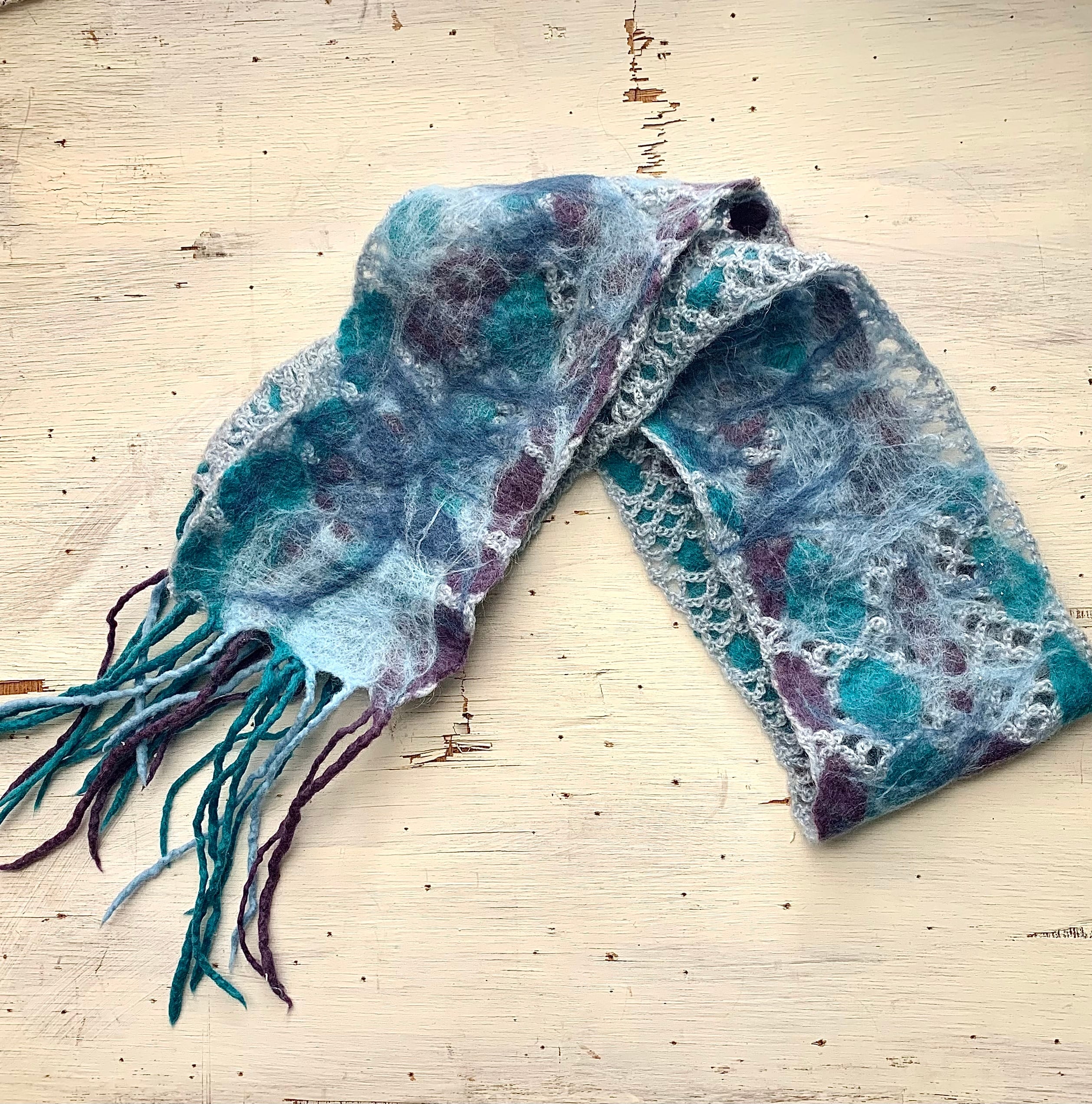 鍵編みの毛糸マフラーに羊毛を絡めてフェルト化している為、毛糸マフラーと一体化しています。