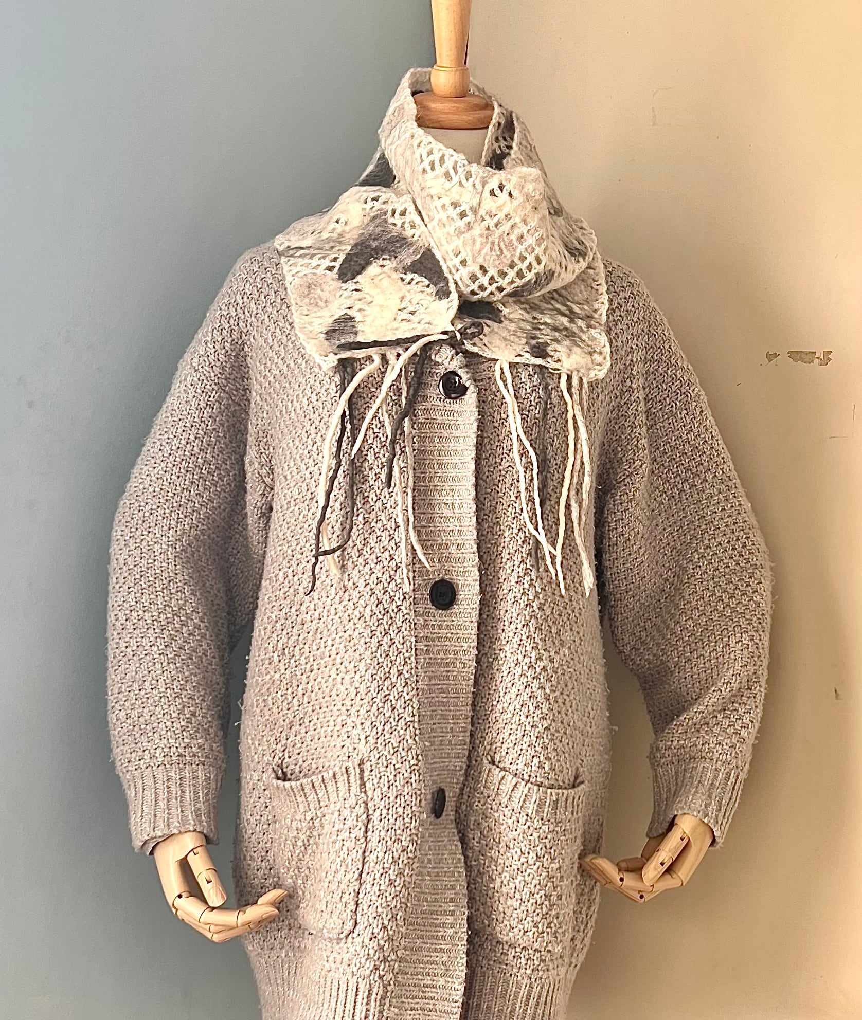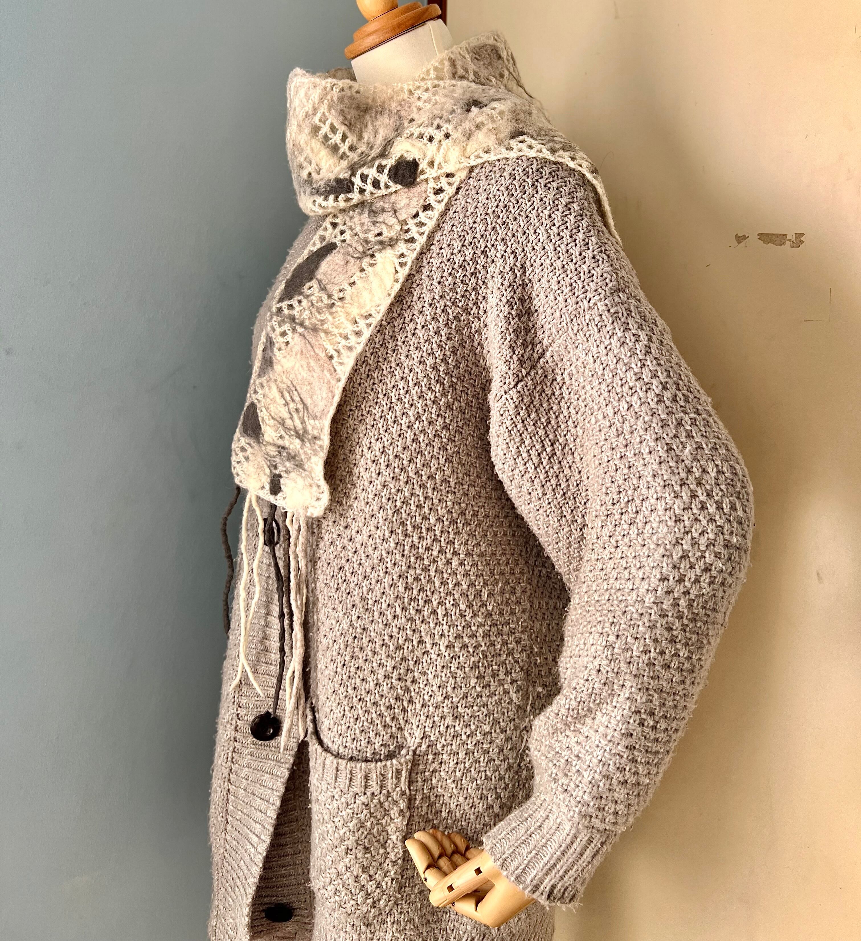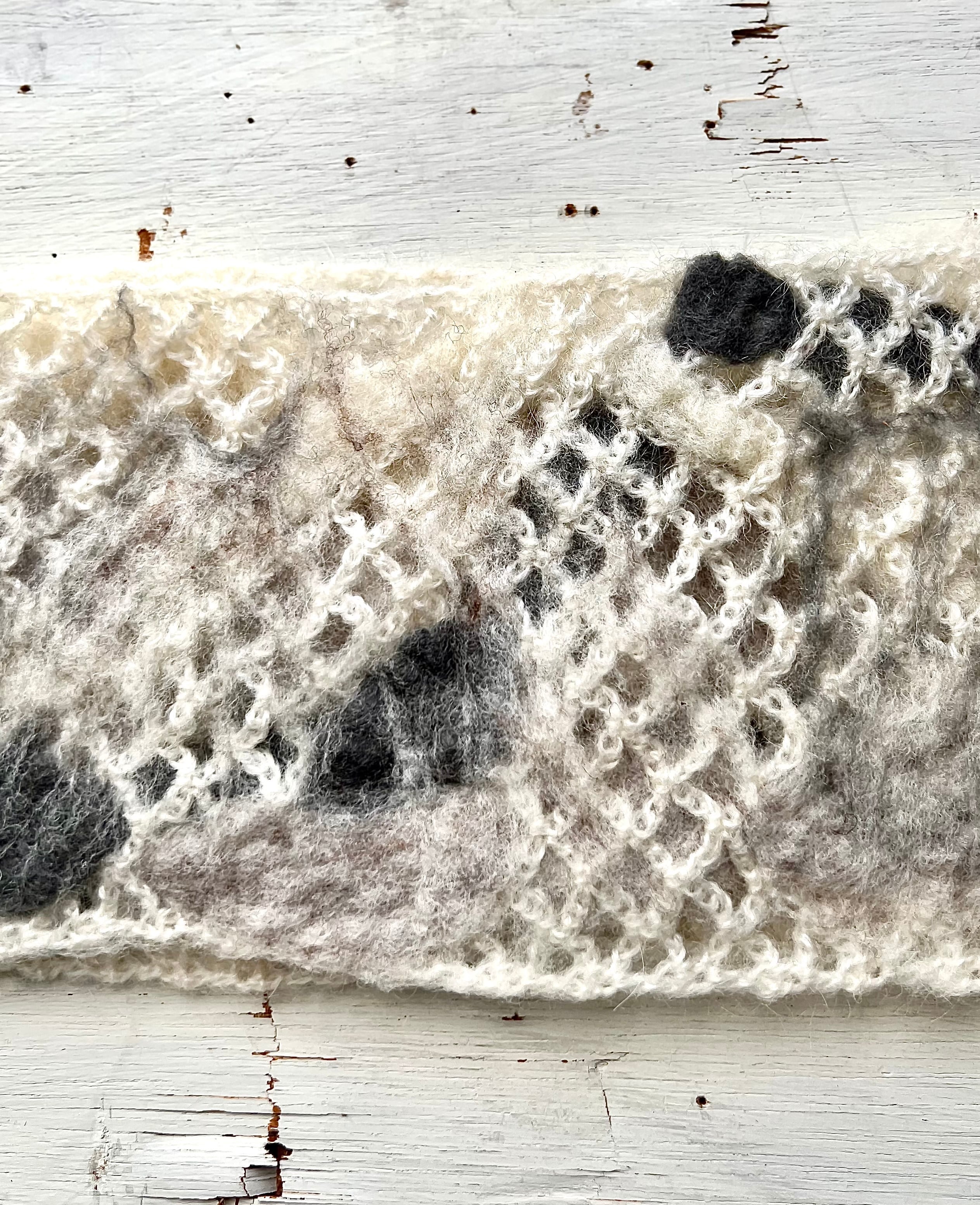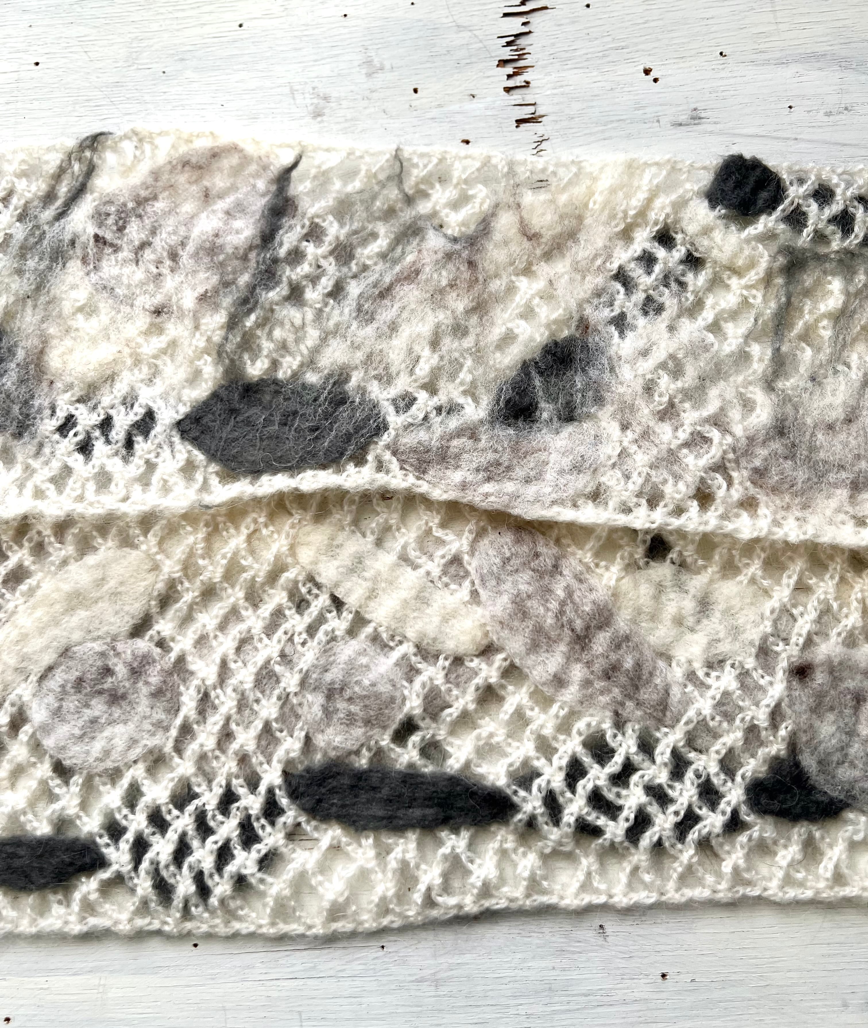 鍵編みの毛糸マフラーに羊毛を絡めてフェルト化している為、毛糸マフラーと一体化しています。