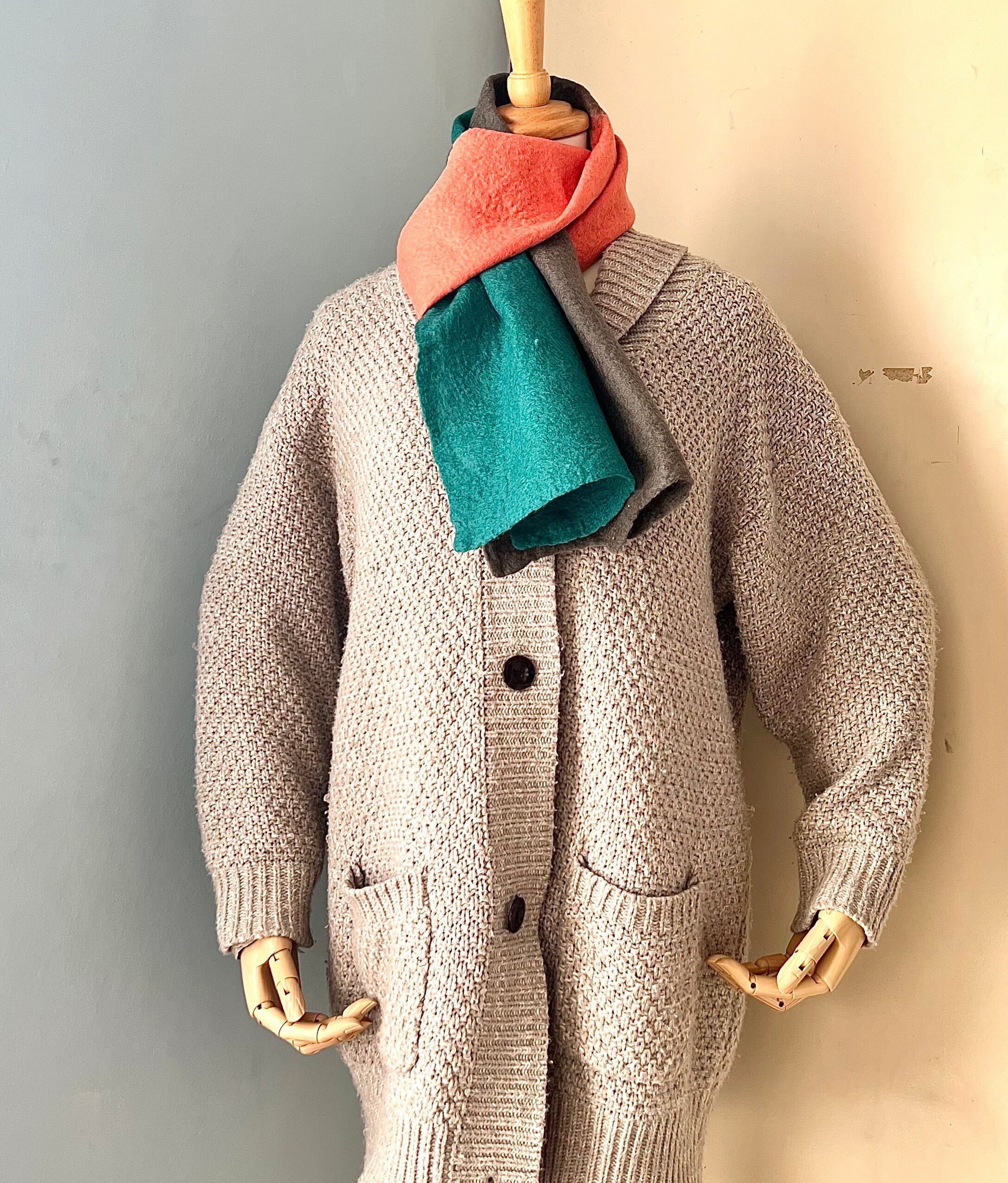 マフラー本体は中心に向かって少し細めになっております。薄手の羊毛フェルトの為軽くて暖かいです。