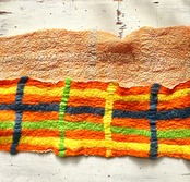 本体は綿のガーゼの上にメリノ羊毛を広げ、お湯と洗剤をかけてビニール手袋をつけて手で擦りガーゼに絡ませながらフェルト化し、本体の生地を制作しています。