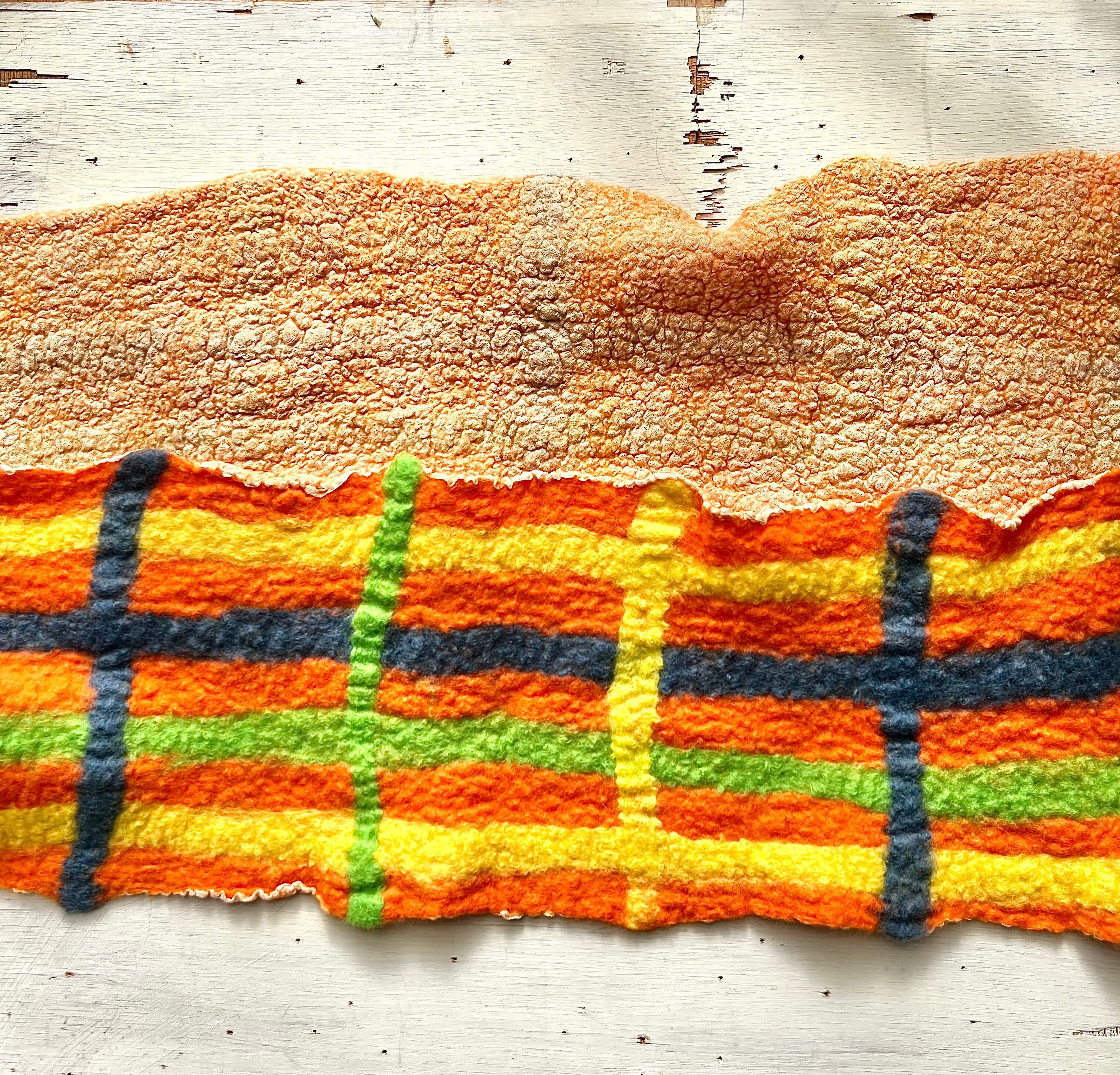 ガーゼ生地に羊毛フェルトを絡ませる事で裏地があるマフラーになりました。