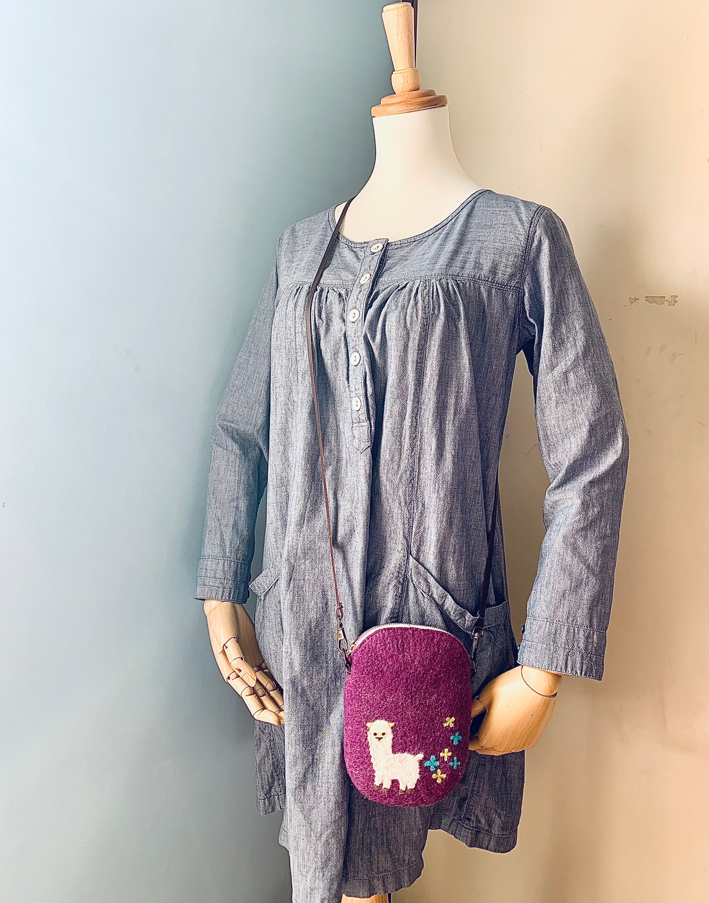 花舞う風景と動物の羊毛フェルトポーチポシェット(アルパカ)