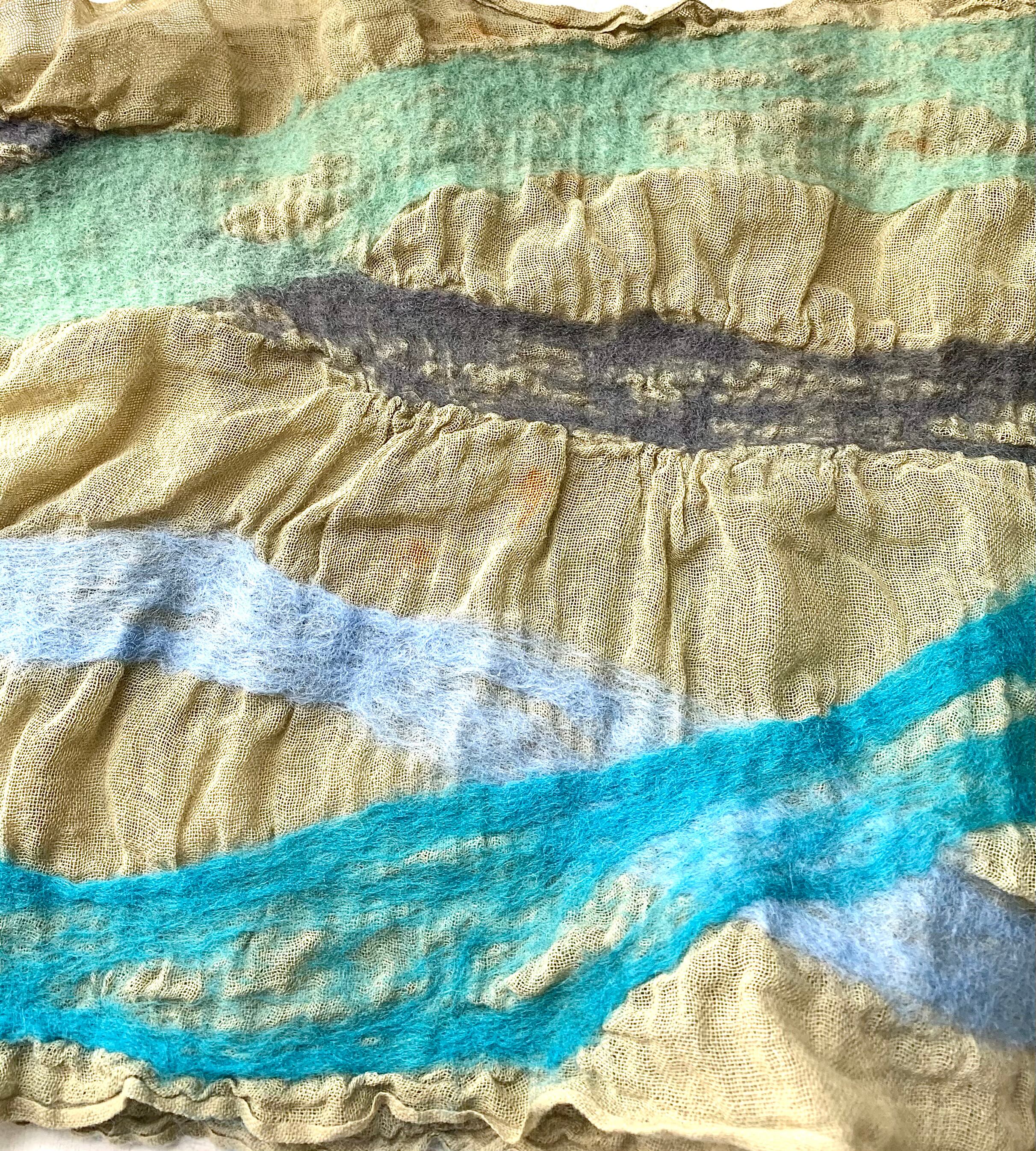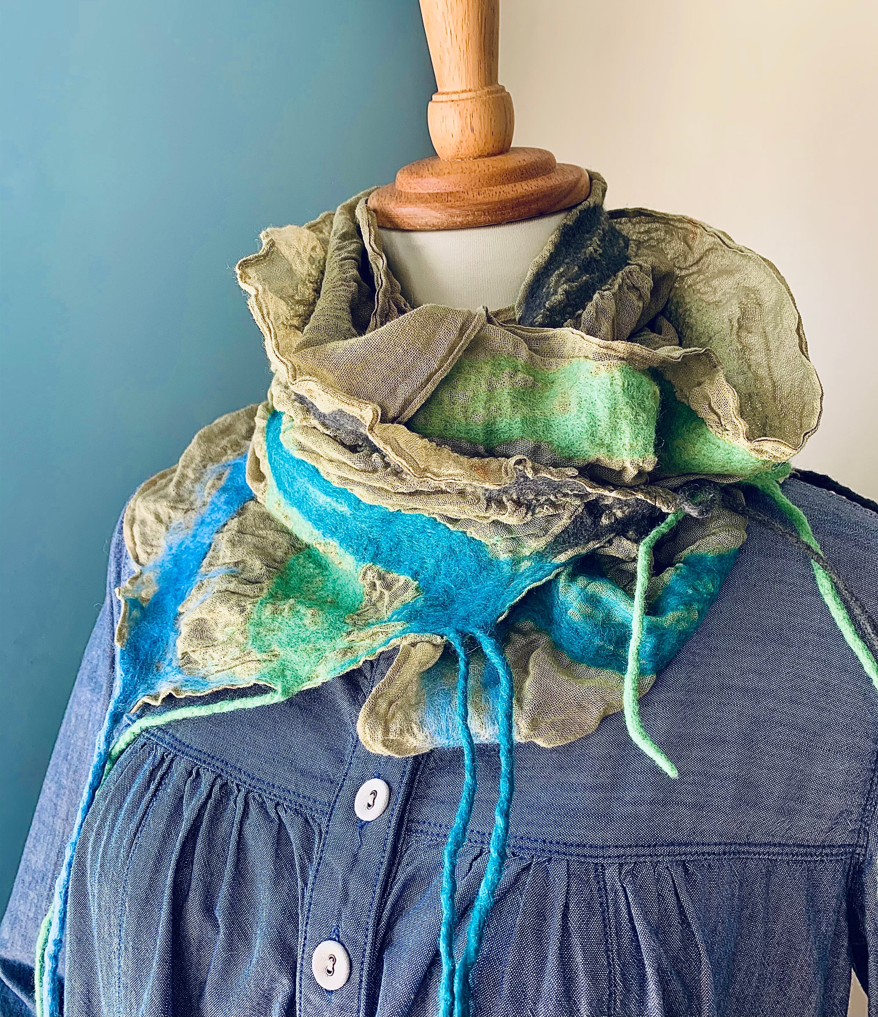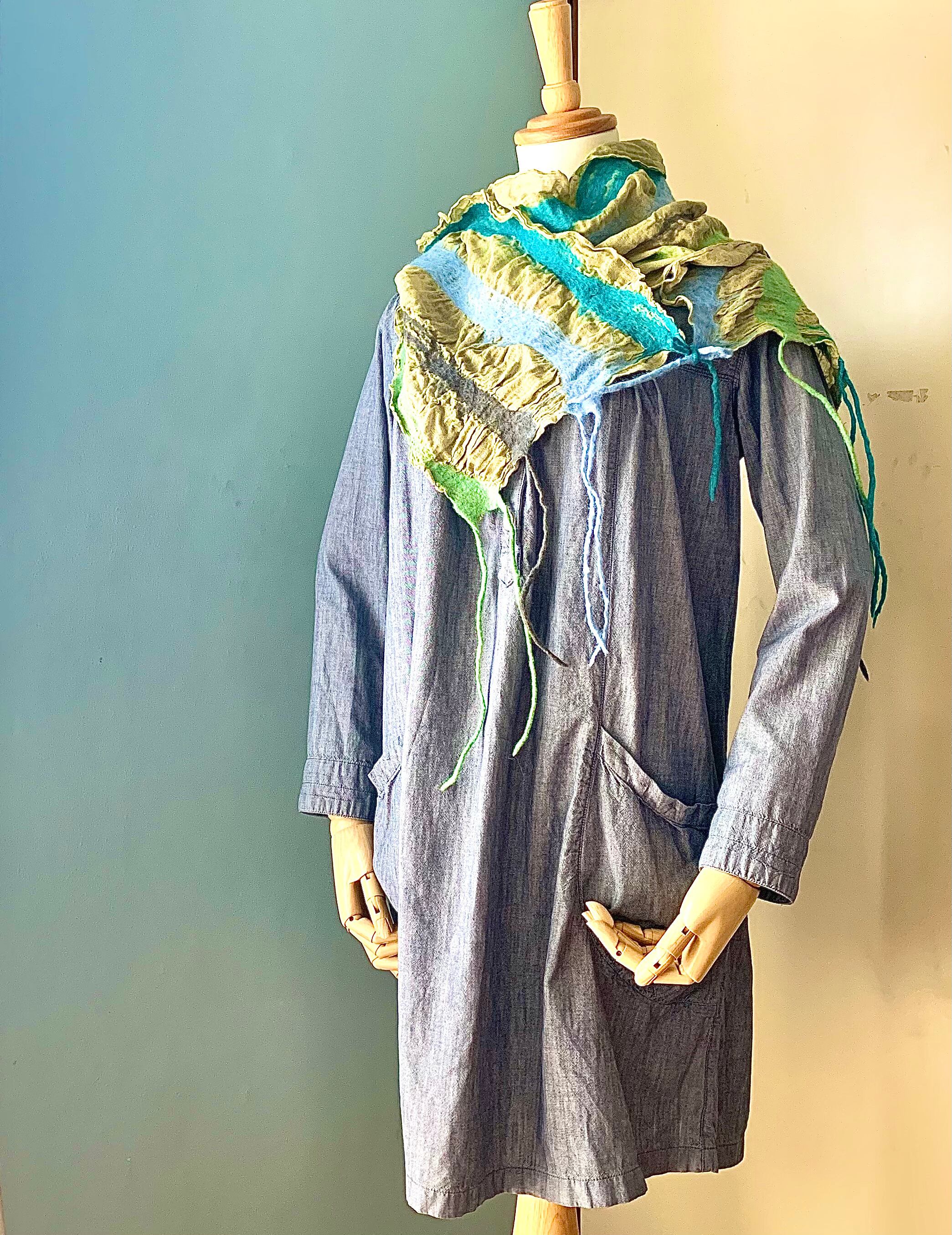 本体はガーゼに羊毛を絡める事によりフェルト化した羊毛に引っ張られて、フリルのようなストールになっています。
