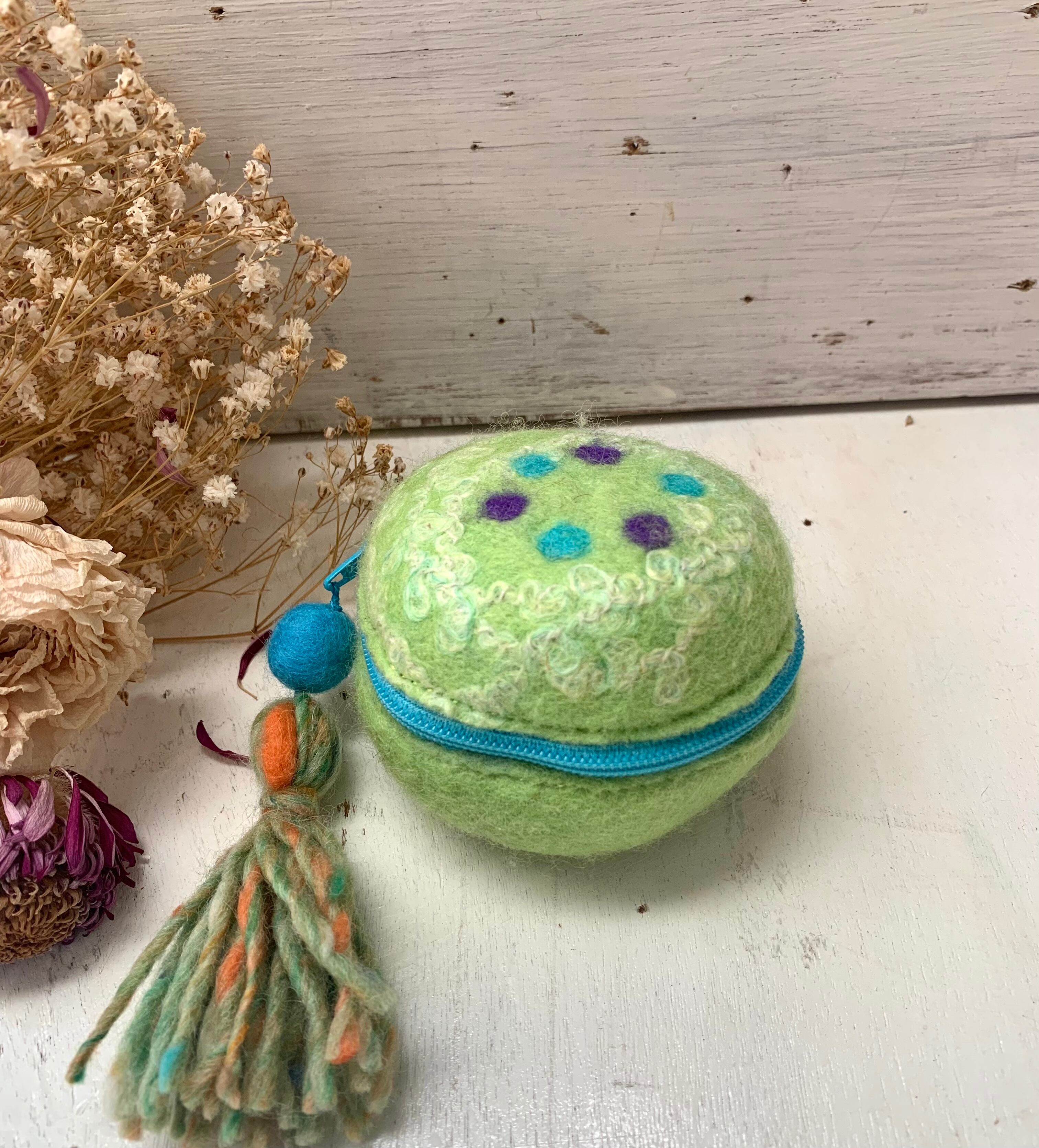 手のひらサイズのマカロン型羊毛フェルトポーチです。