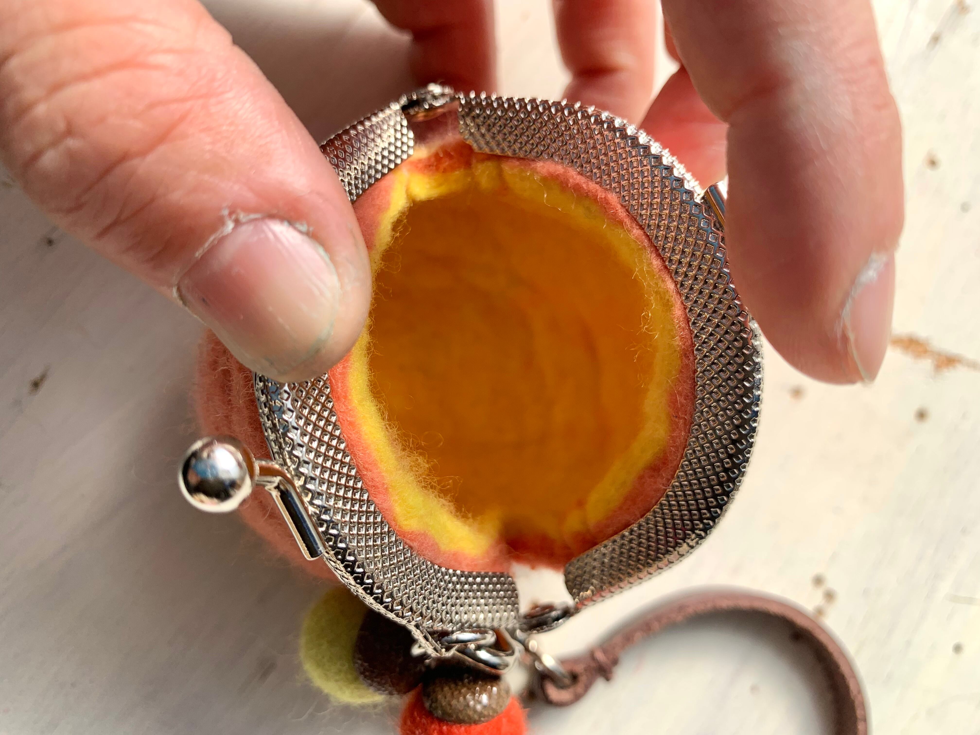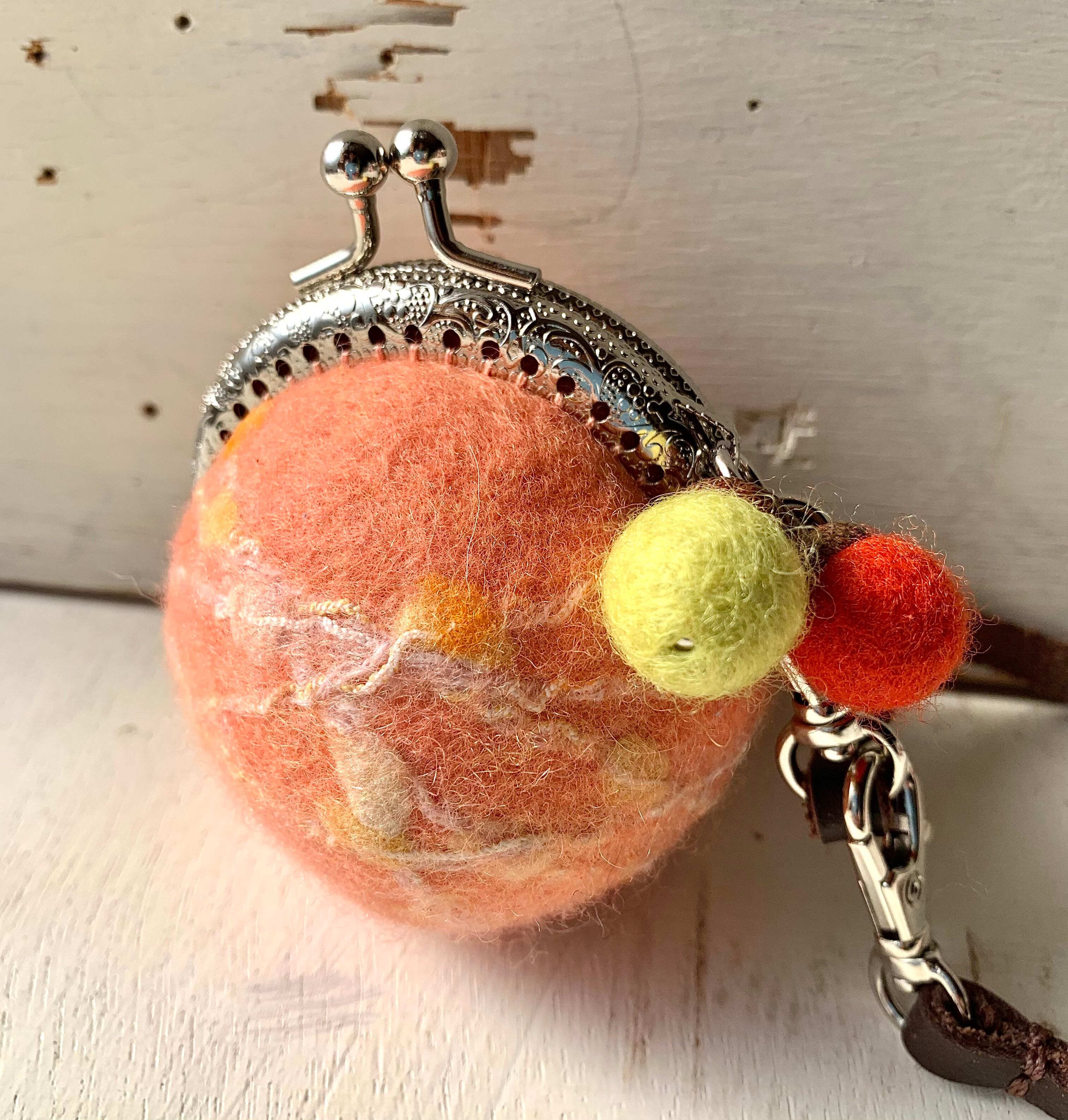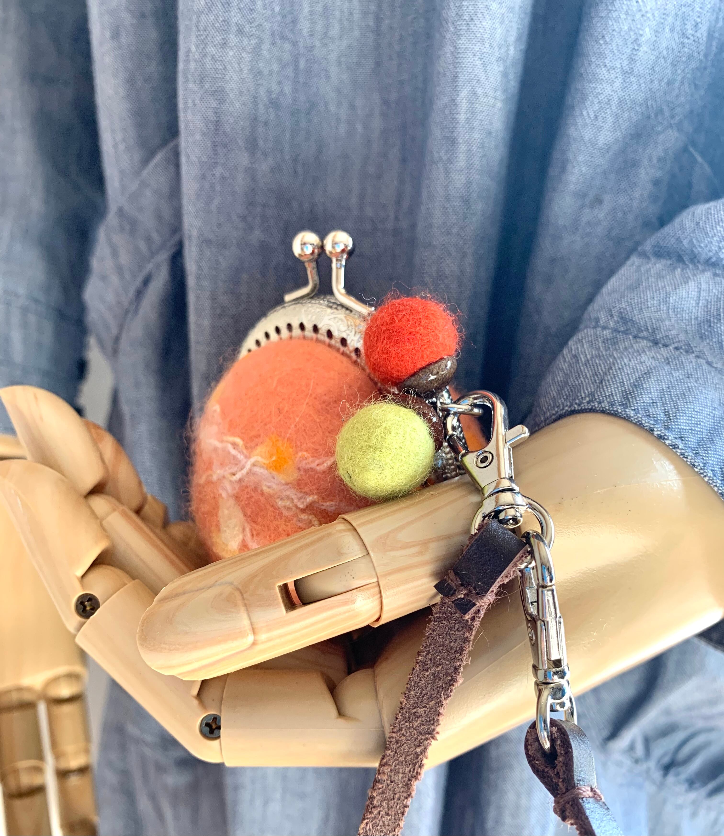 手のひらサイズの球体の羊毛フエルトがま口で、バックの外付けができるタイプです。
