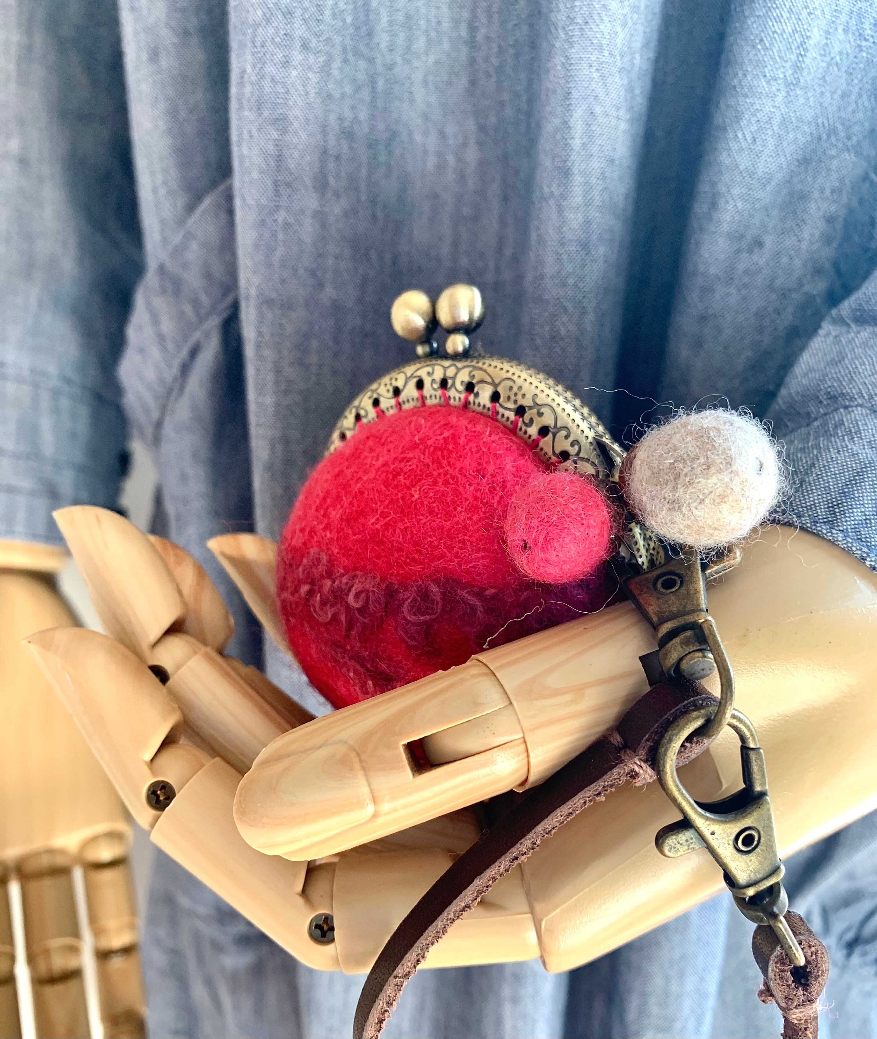 手のひらサイズの球体の羊毛フエルトがま口で、バックの外付けができるタイプです。