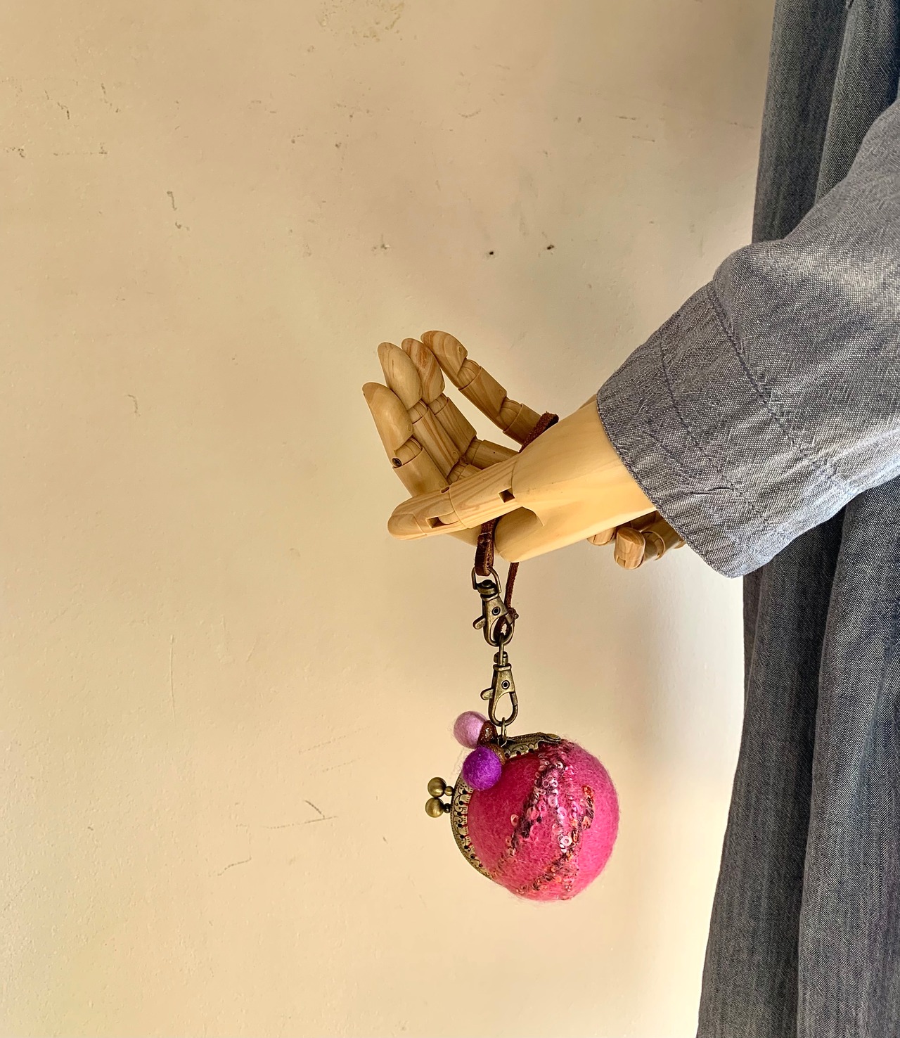 手のひらサイズの球体の羊毛フエルトがま口で、バックの外付けができるタイプです。