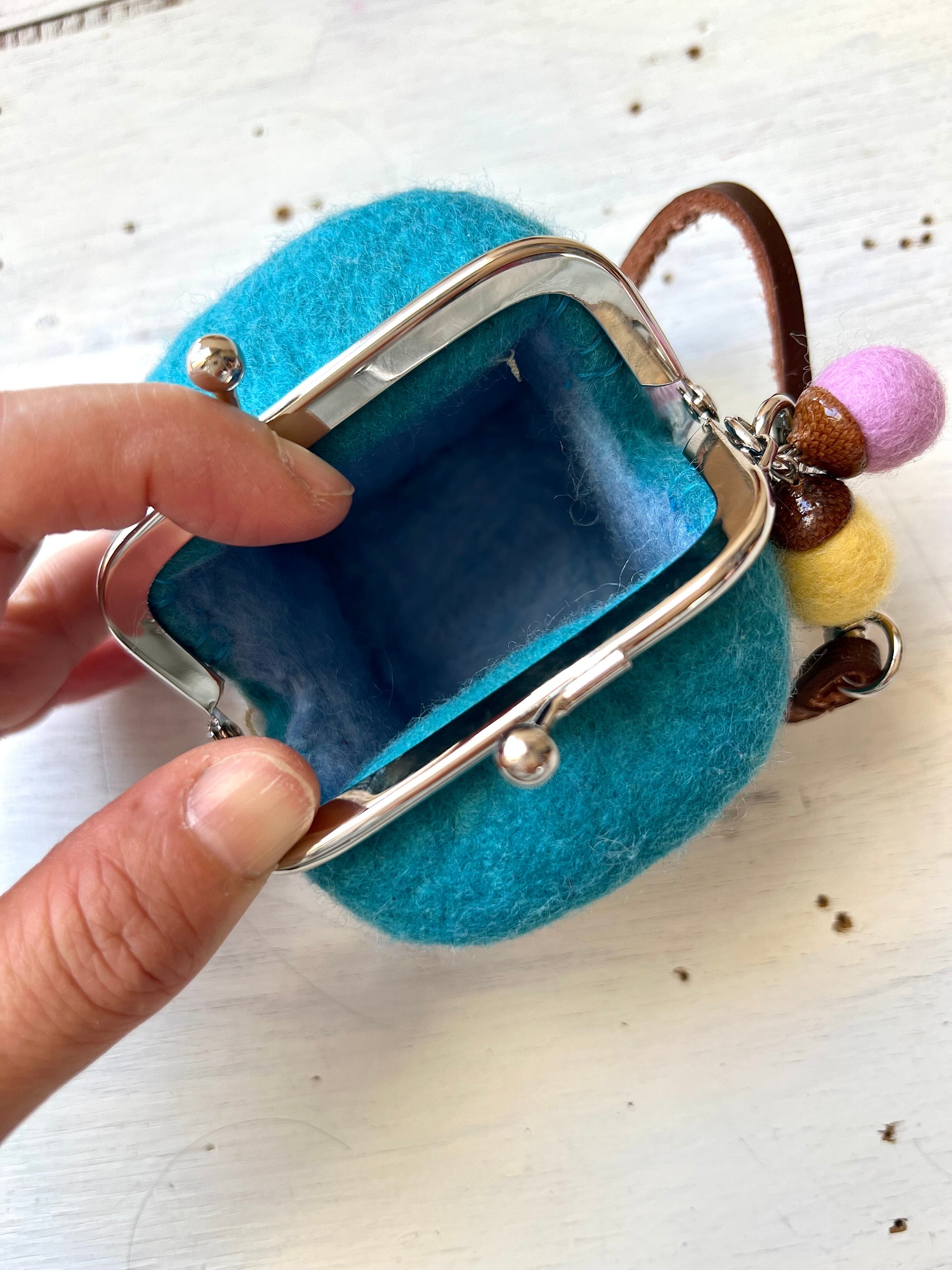 手のひらサイズの球体の羊毛フエルトがま口で、バックの外付けができるタイプです。