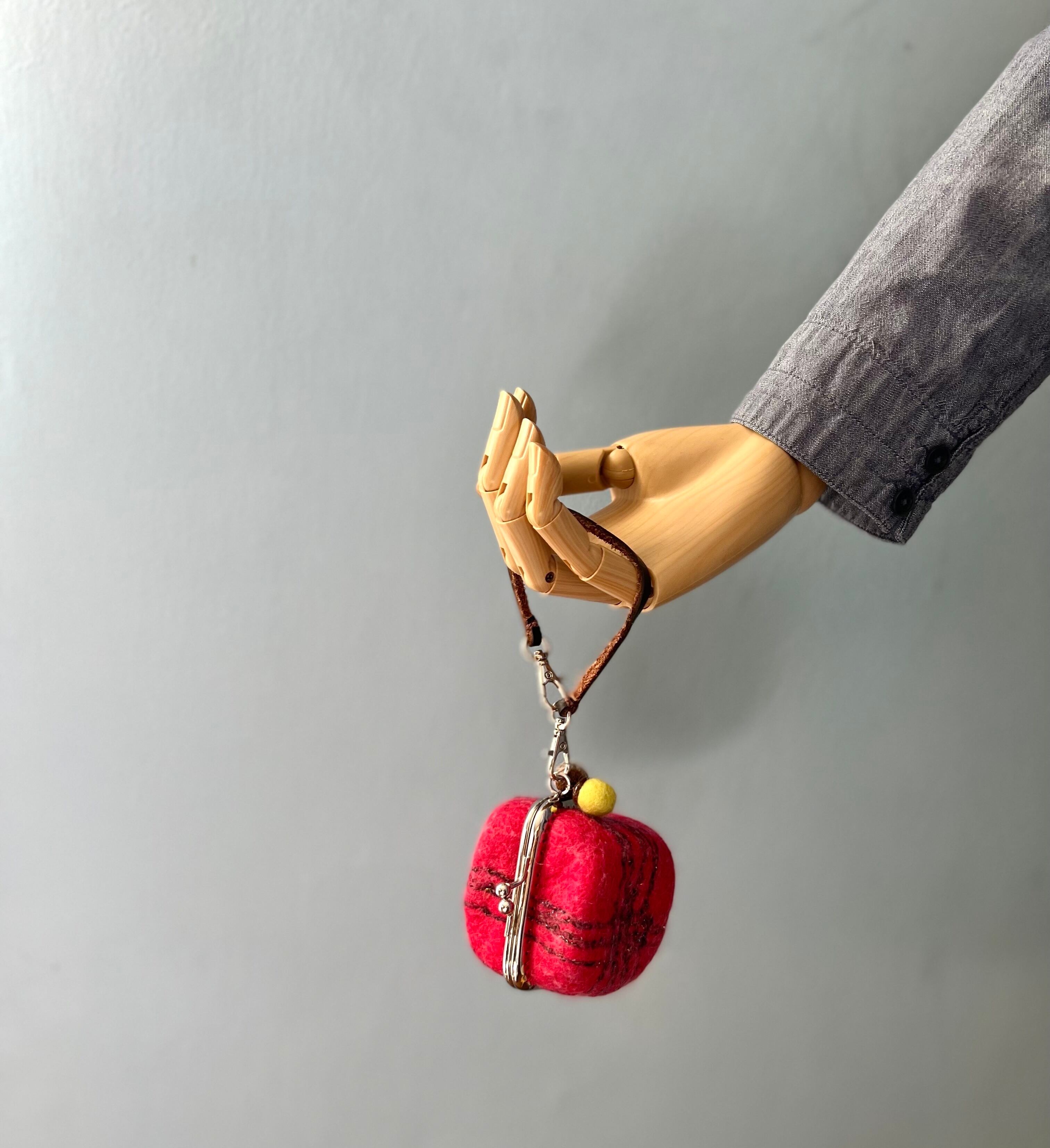 手のひらサイズの球体の羊毛フエルトがま口で、バックの外付けができるタイプです。