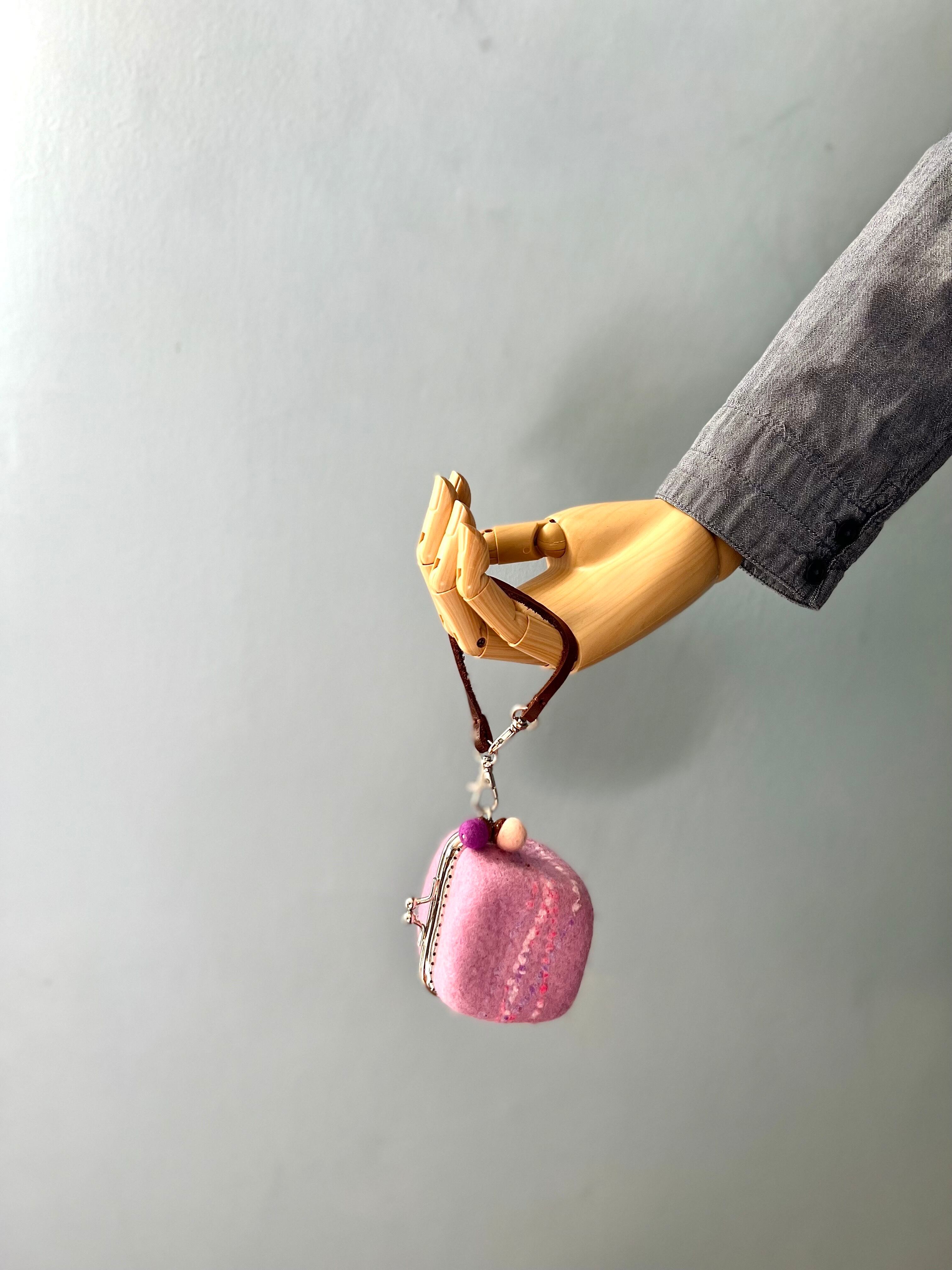 手のひらサイズの球体の羊毛フエルトがま口で、バックの外付けができるタイプです。