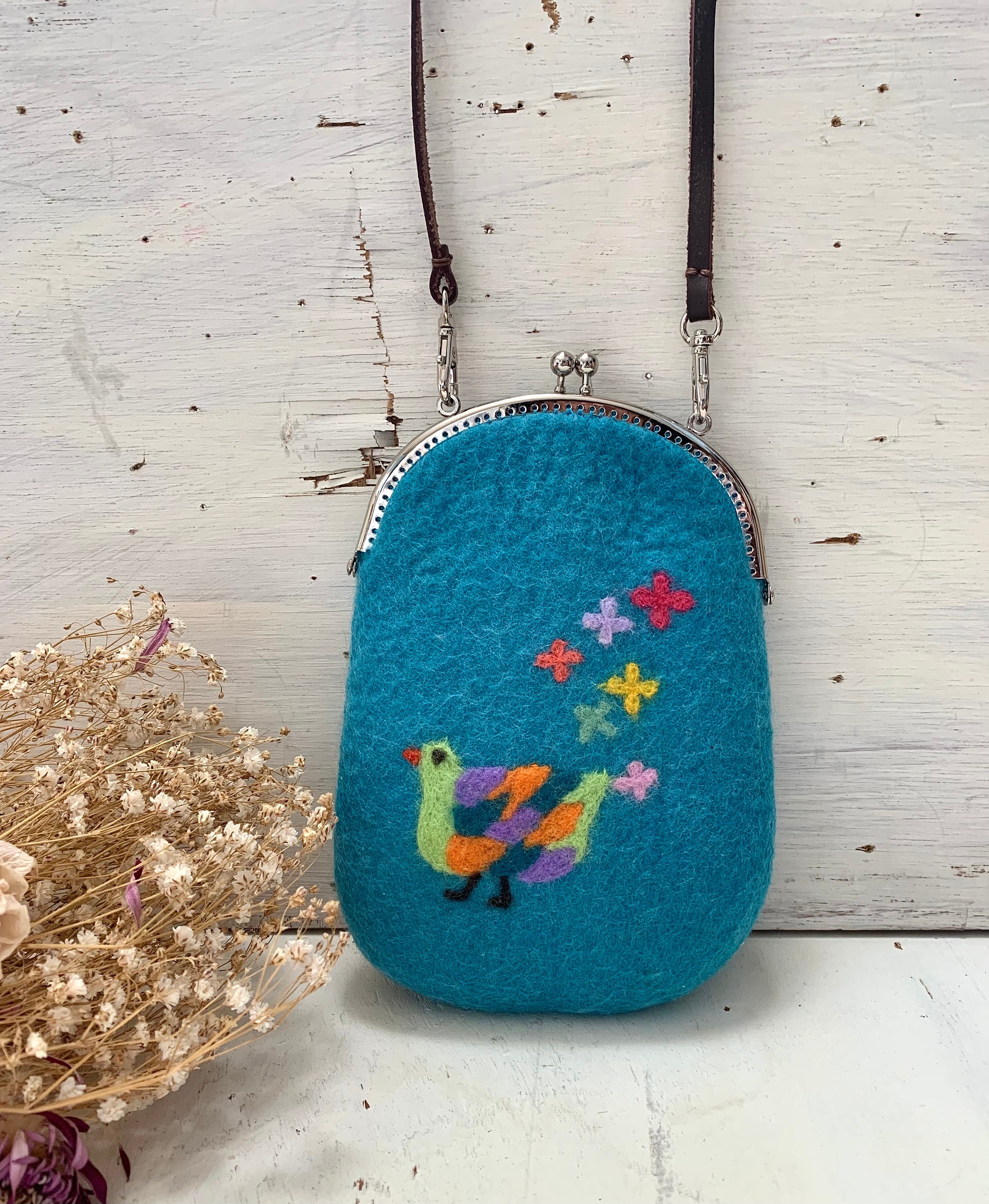 花舞う風景と小鳥の羊毛フェルトポーチポシェット(ブルー)