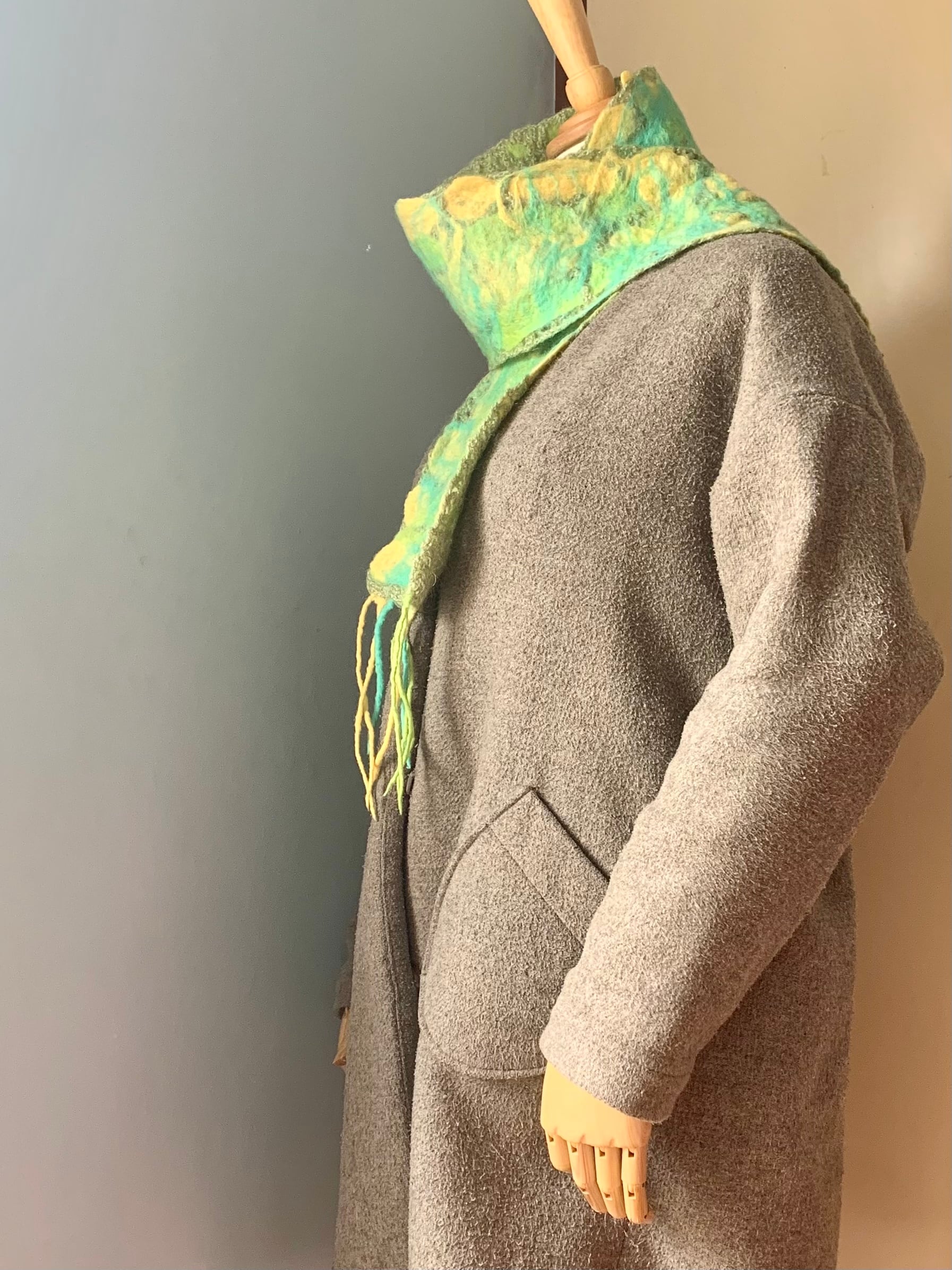 鍵編みの毛糸マフラーに羊毛を絡めてフェルト化している為、毛糸マフラーと一体化しています。