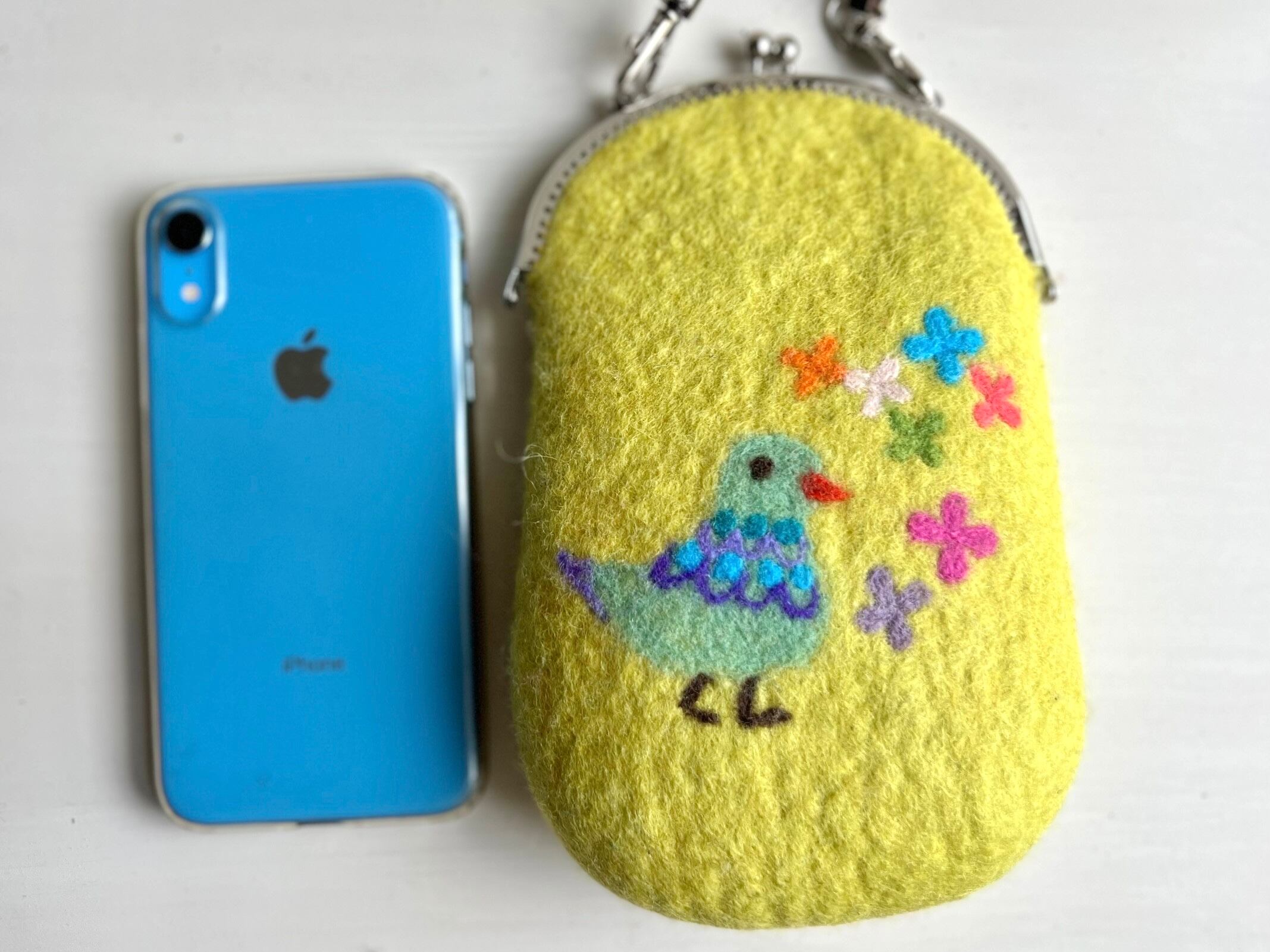 花舞う風景と小鳥の羊毛フェルトポーチポシェット(銀杏)