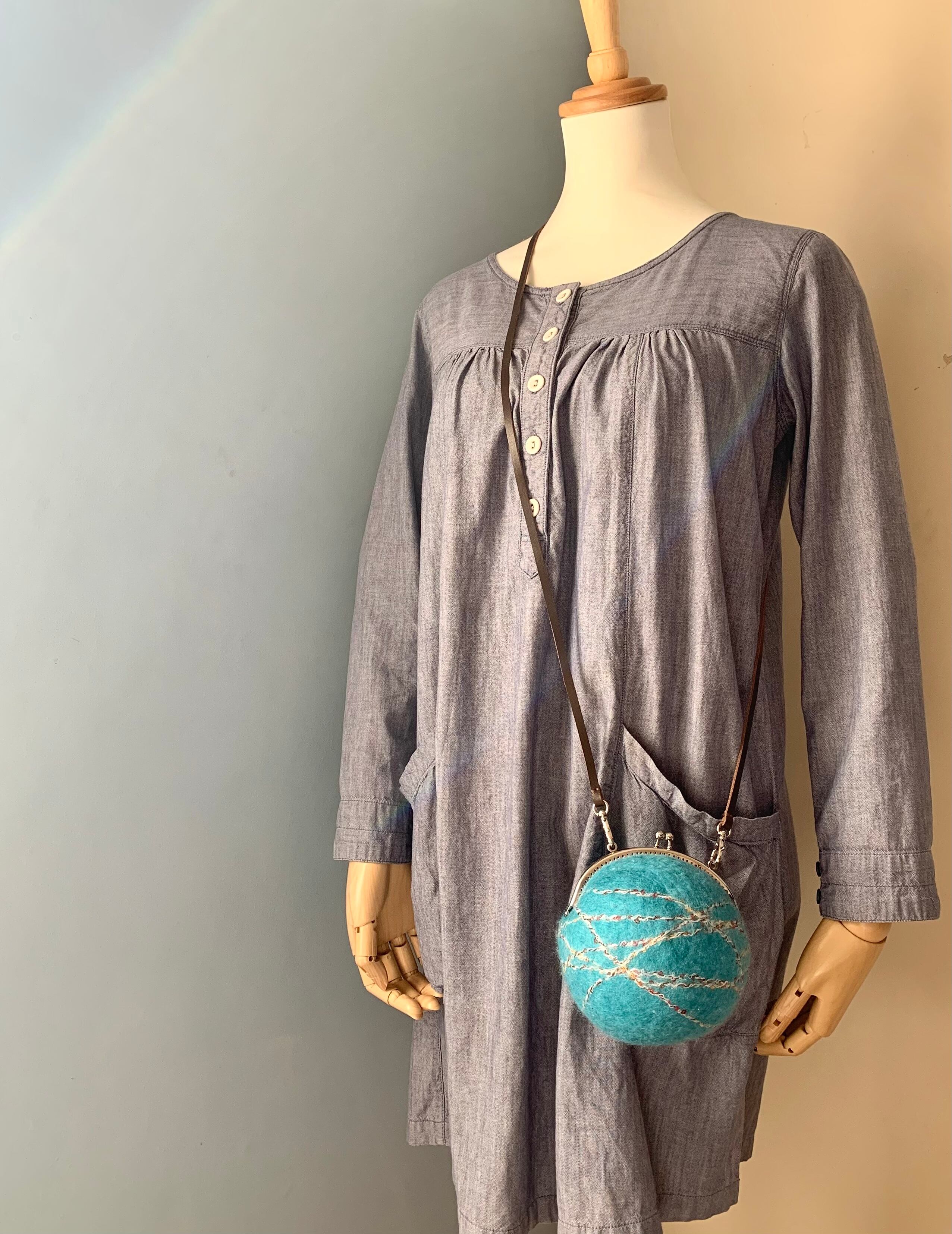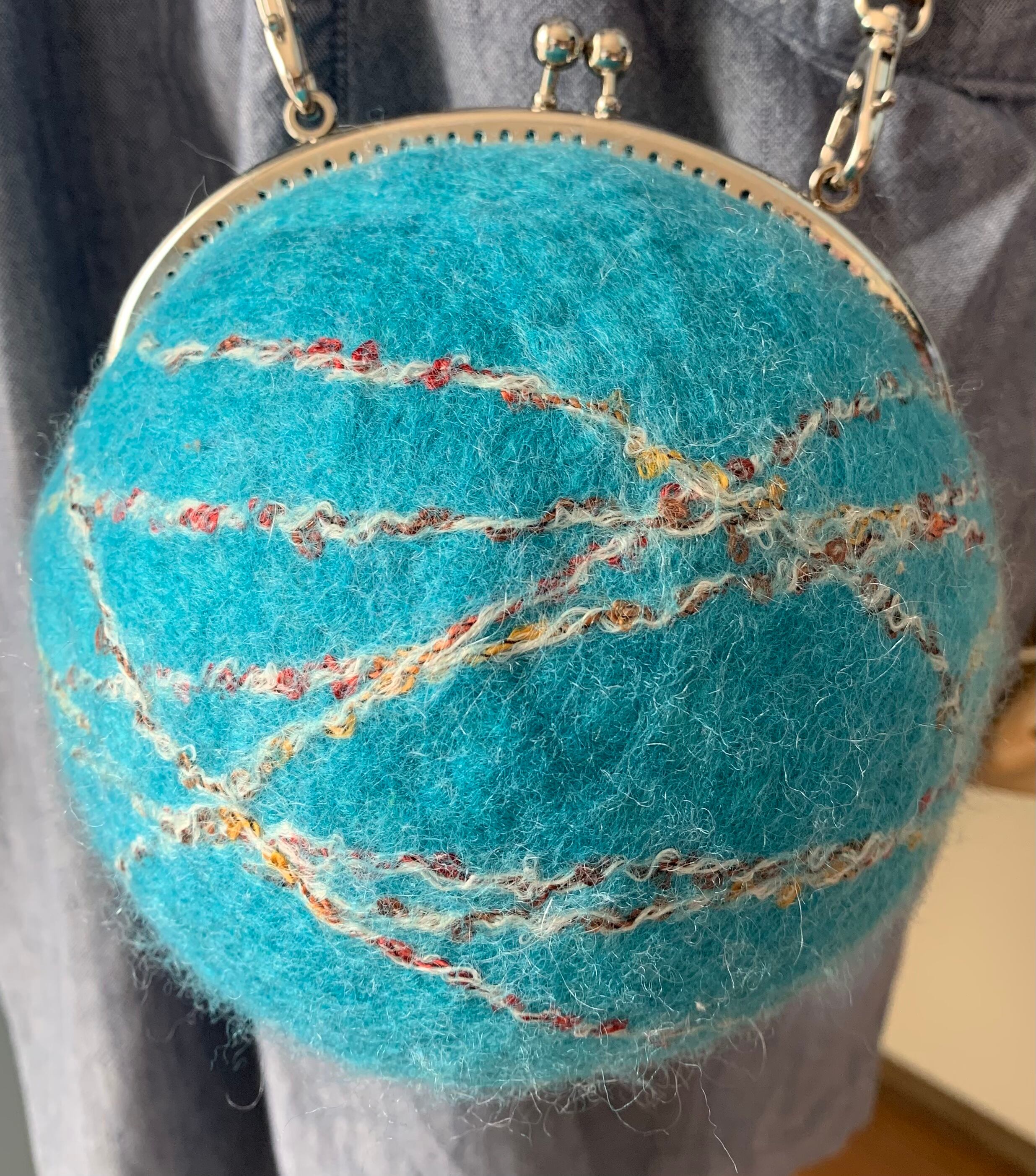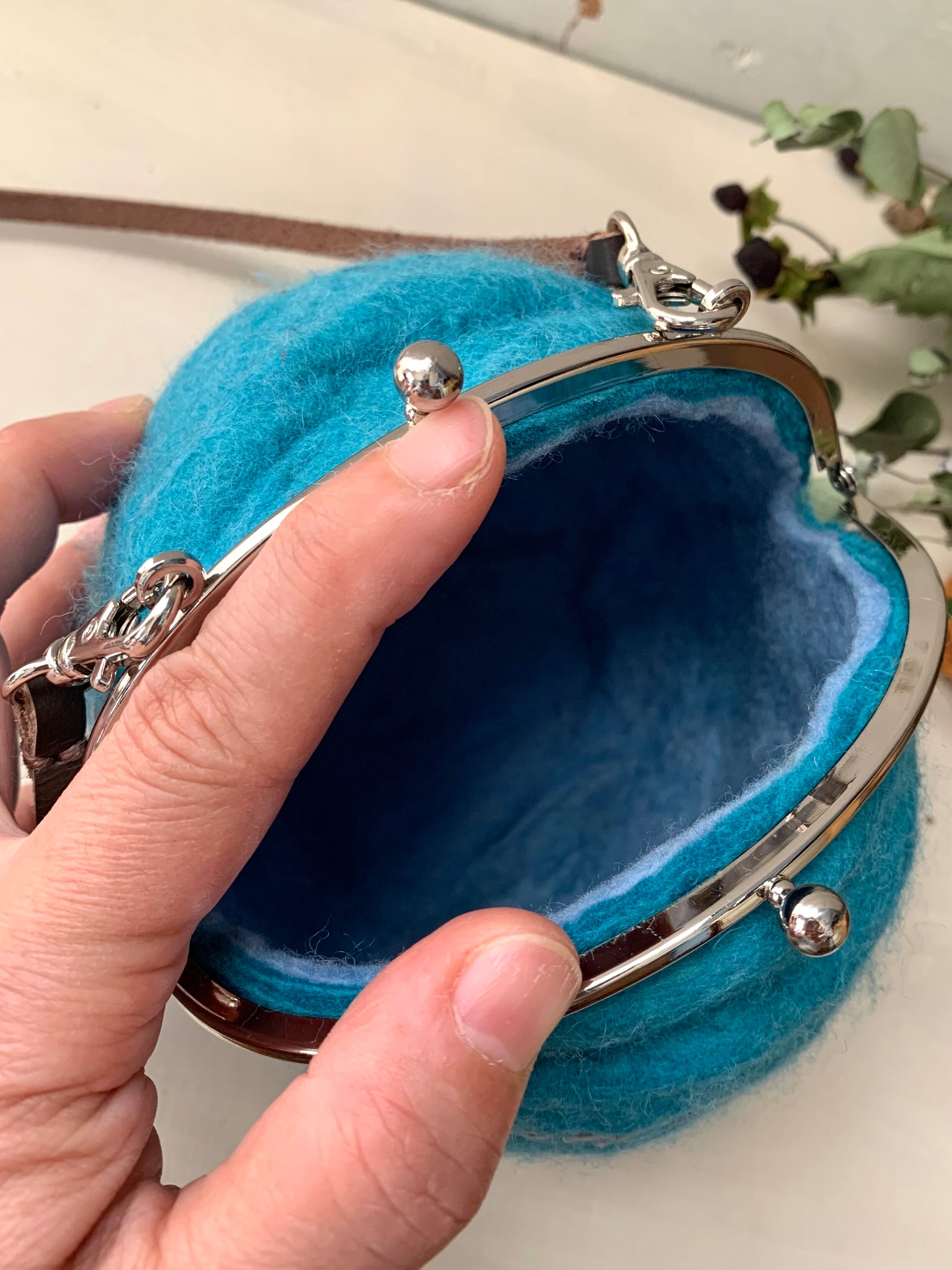 球体の羊毛フエルトがま口で、ポシェットタイプです。