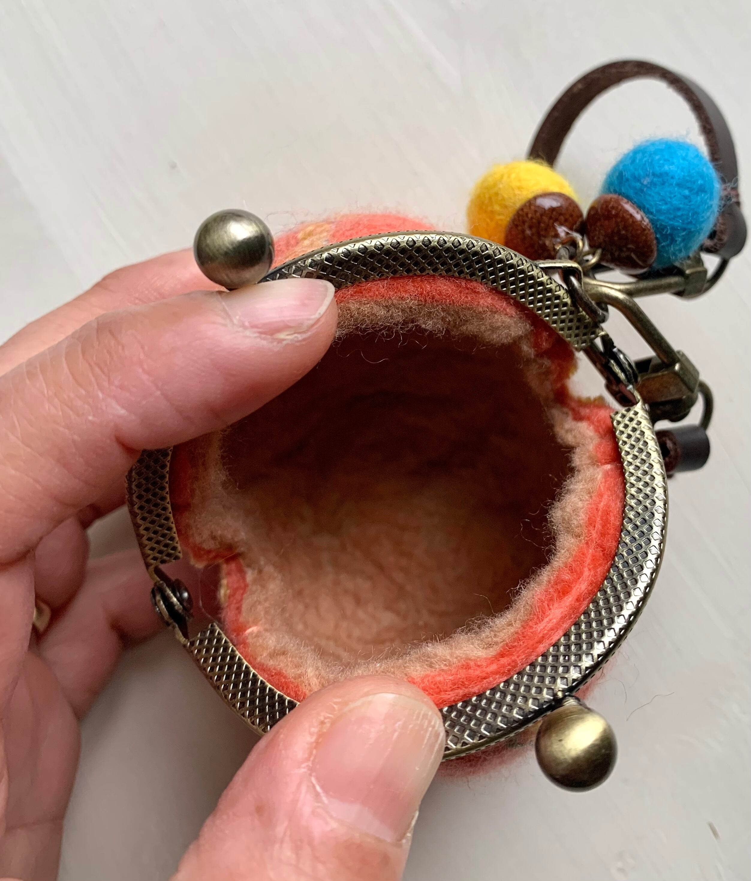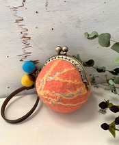 手のひらサイズの球体の羊毛フエルトがま口で、バックの外付けができるタイプです。