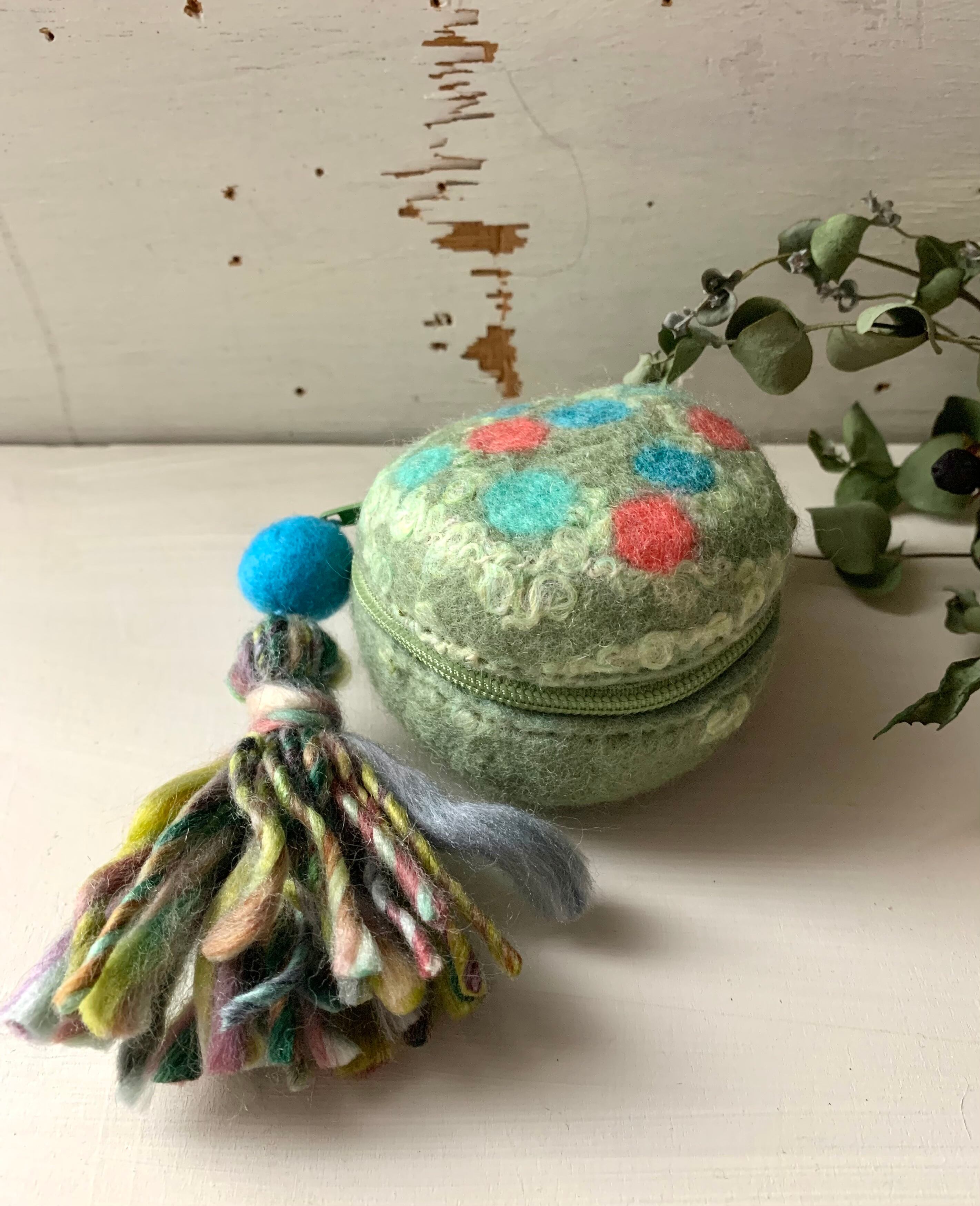 手のひらサイズのマカロン型羊毛フェルトポーチです。