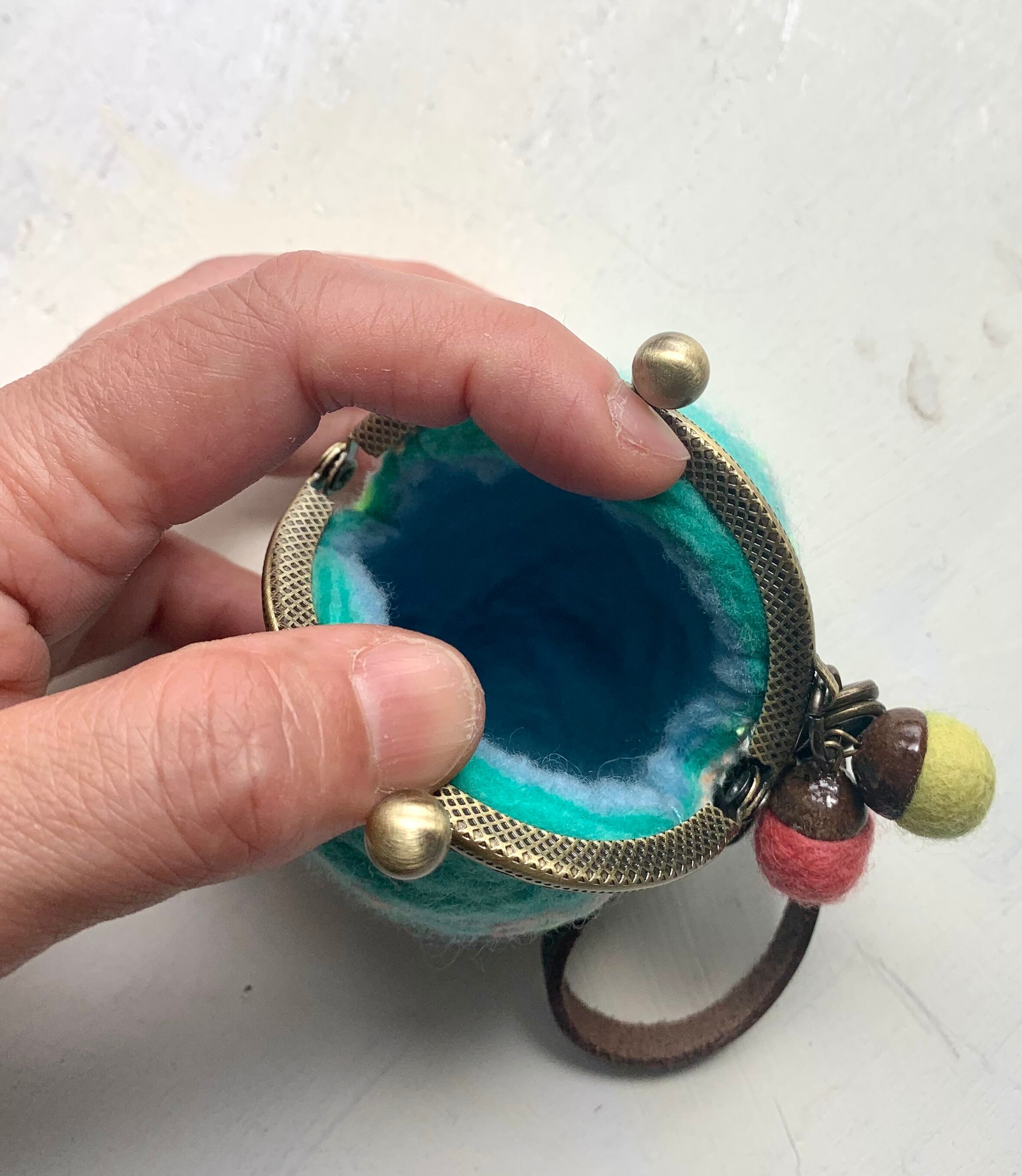 手のひらサイズの球体の羊毛フエルトがま口で、バックの外付けができるタイプです。