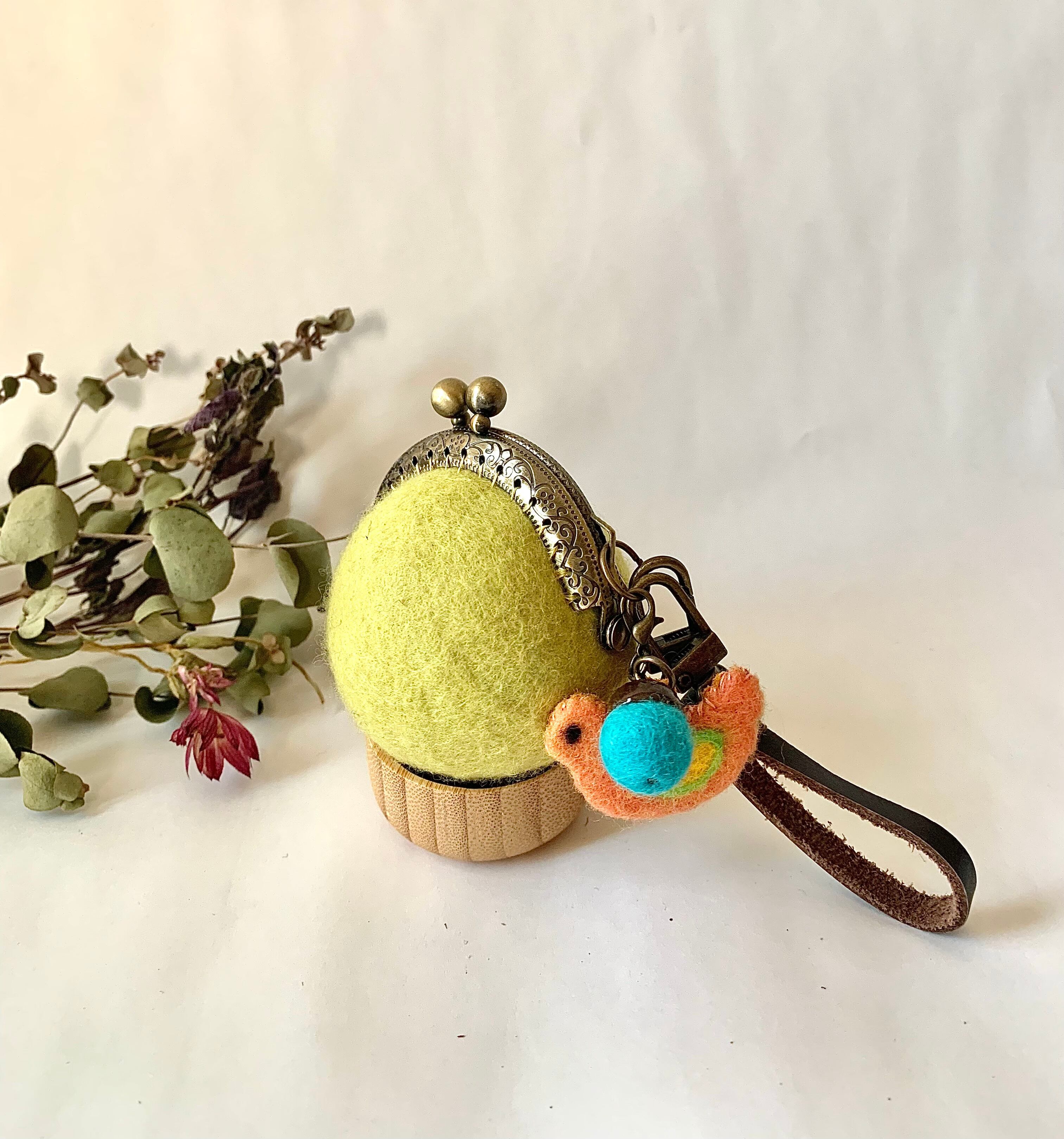 手のひらサイズの球体の羊毛フエルトがま口で、バックの外付けができるタイプです。