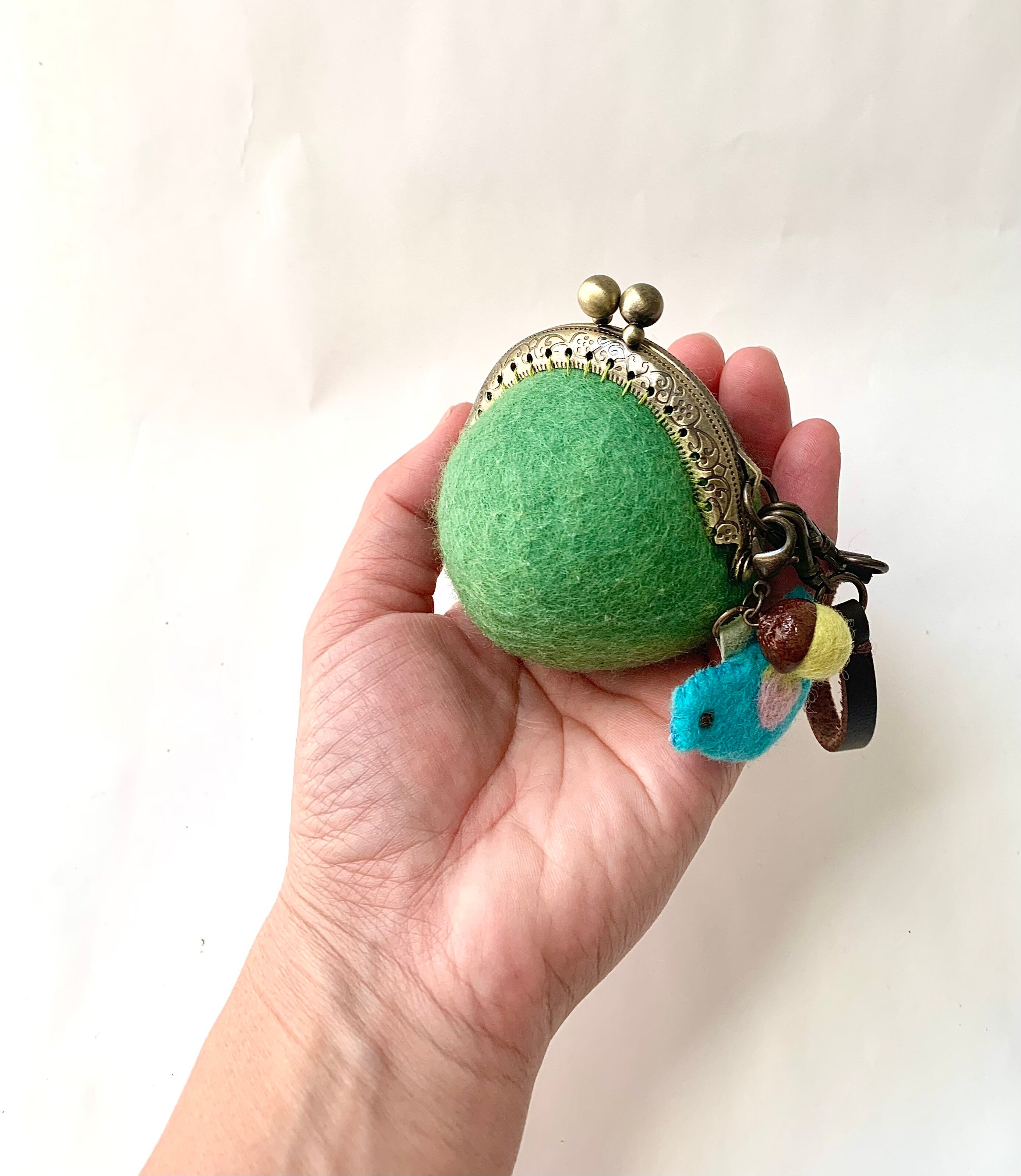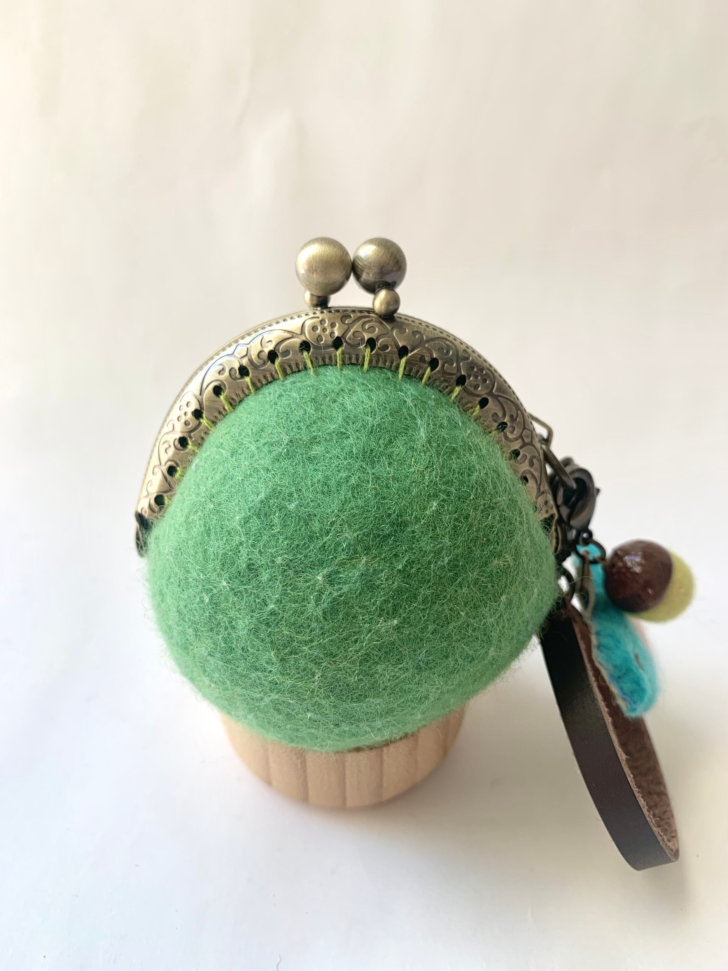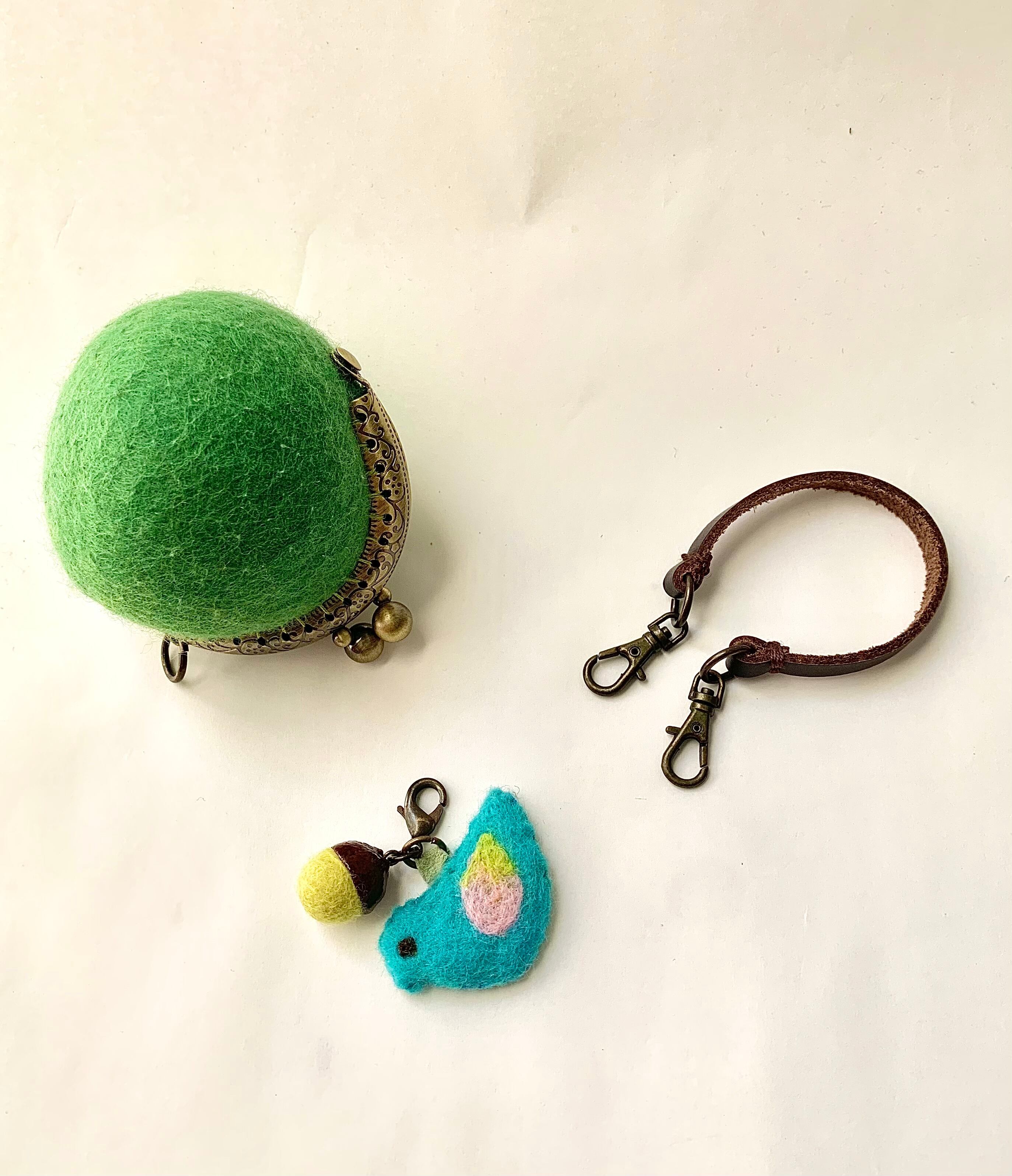 小鳥とどんぐりの羊毛フェルトまんまるがま口(若草)