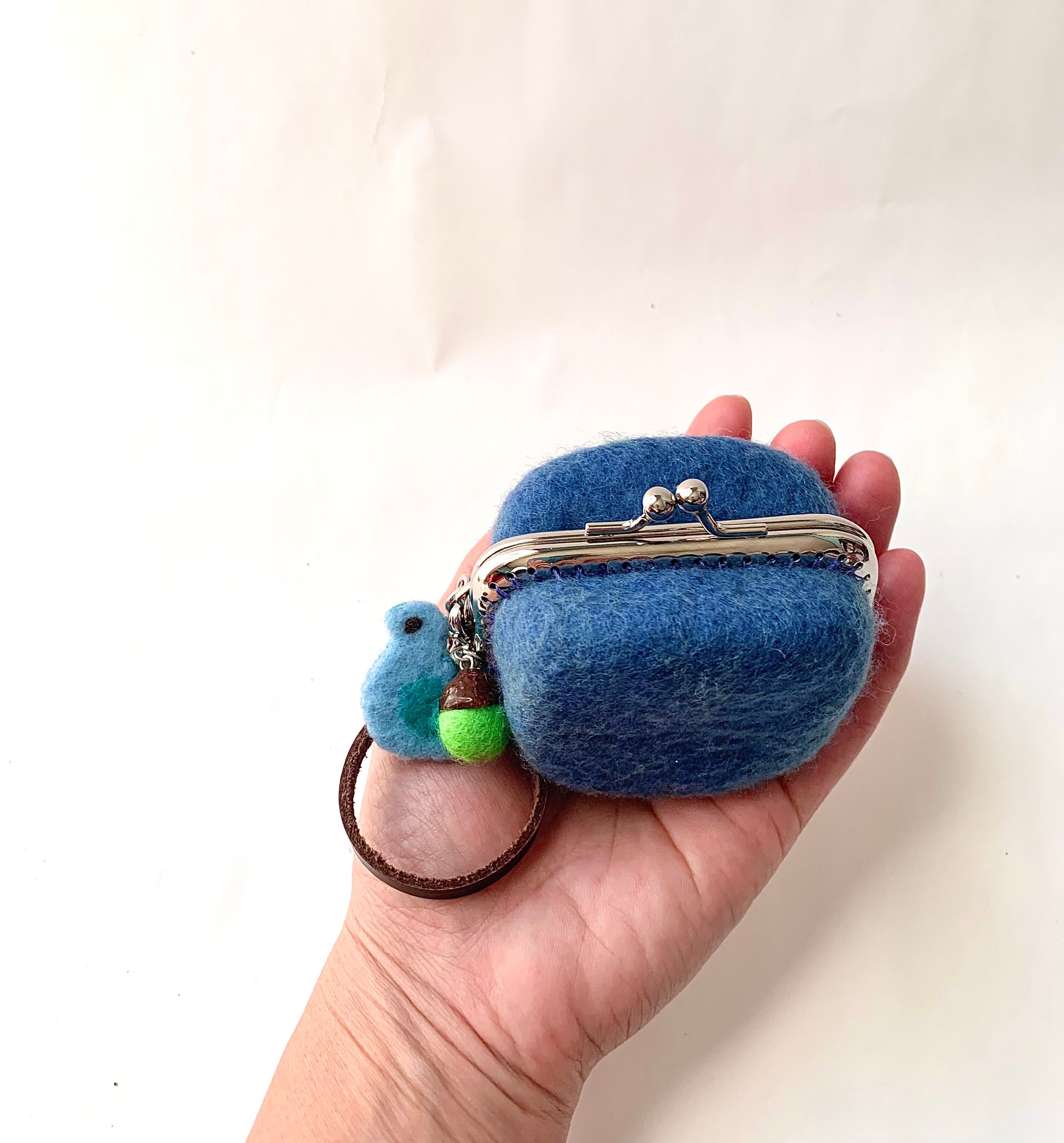 手のひらサイズの球体の羊毛フエルトがま口で、バックの外付けができるタイプです。