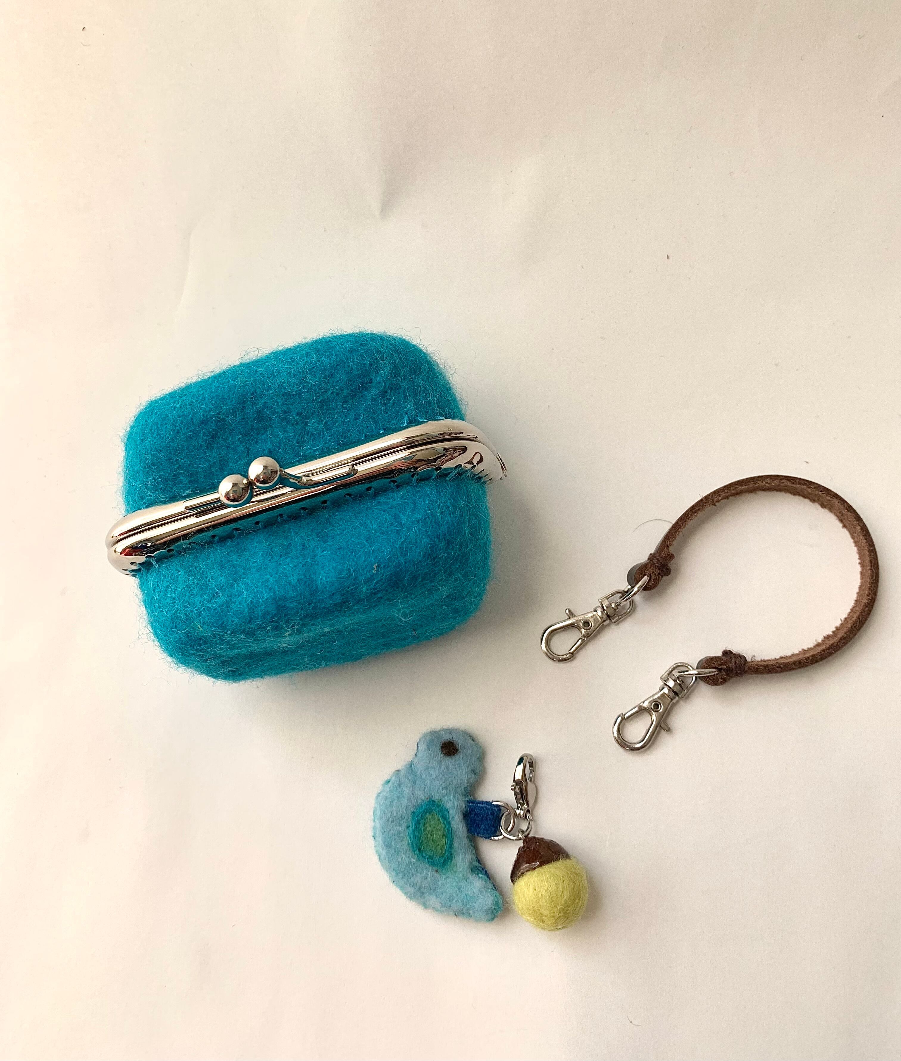 小鳥とどんぐりの羊毛フェルト四角がま口(トルコブルー)