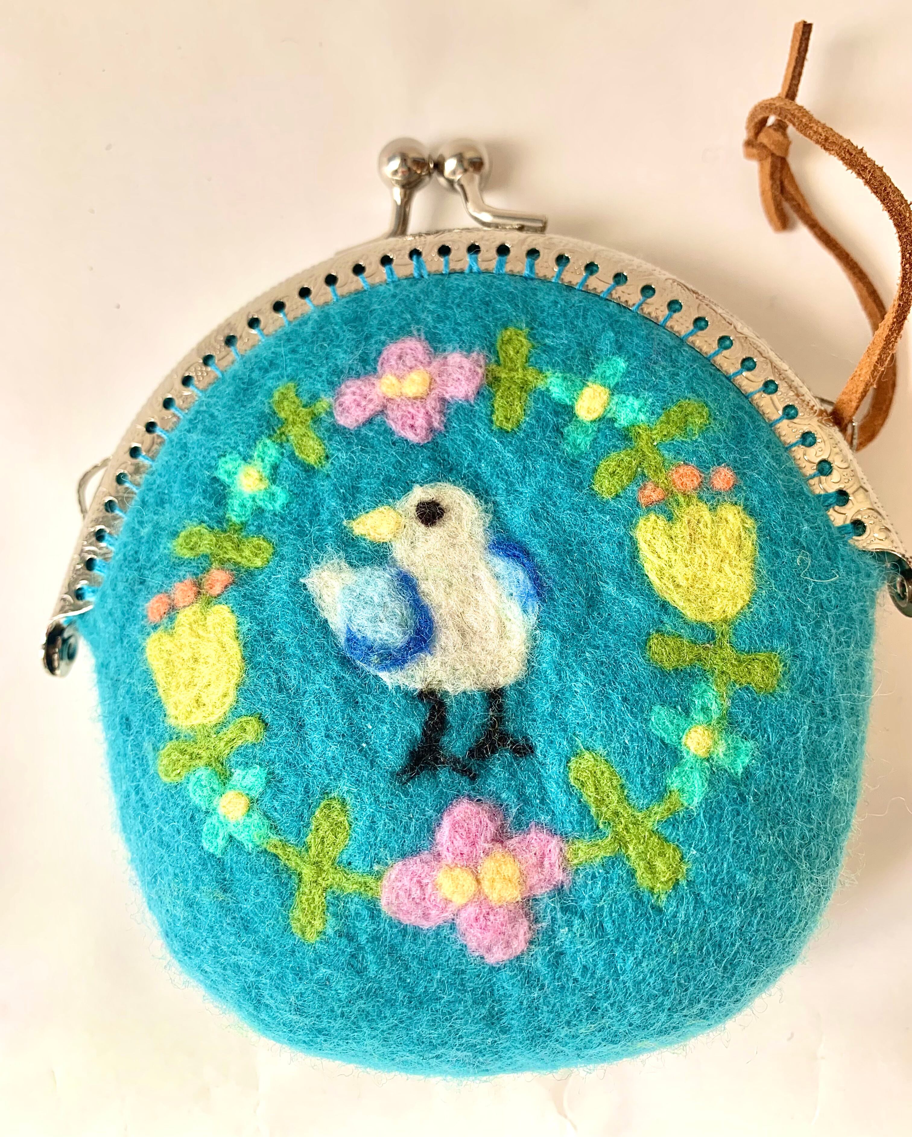 可愛らしいお花のリースと小鳥の刺繍が施されたま口が、目を引くアイテムです。