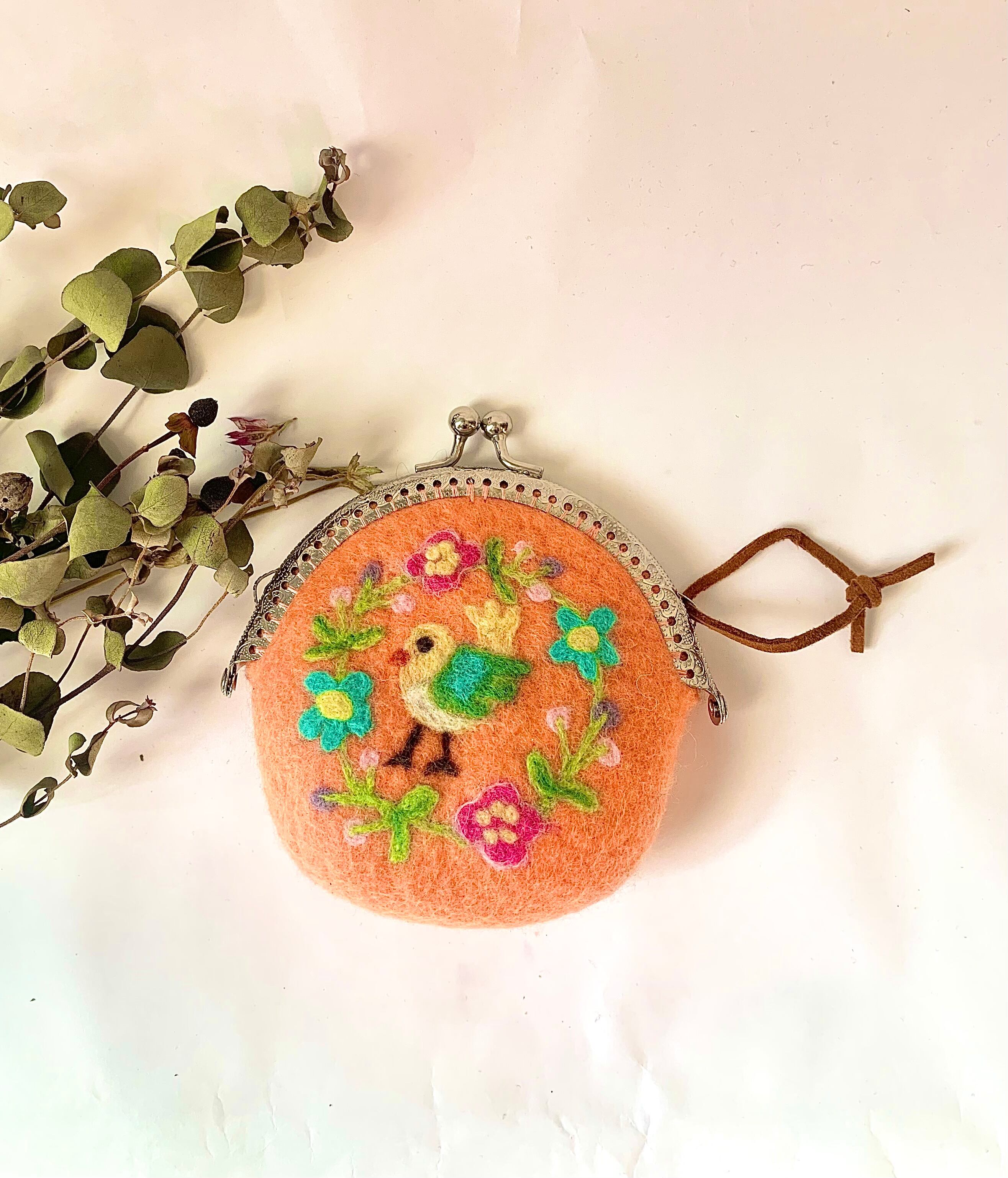 可愛らしいお花のリースと小鳥の刺繍が施されたま口が、目を引くアイテムです。