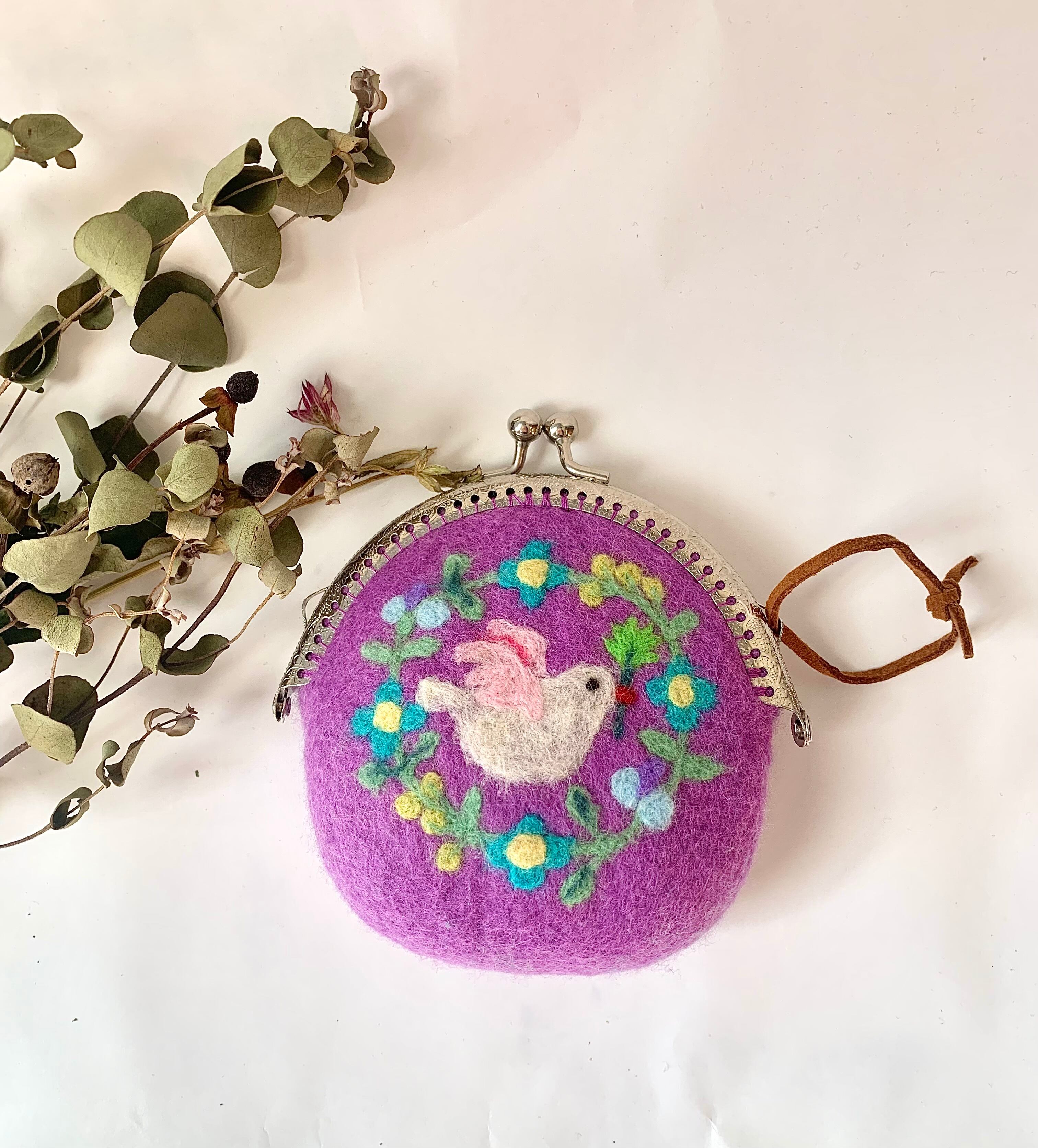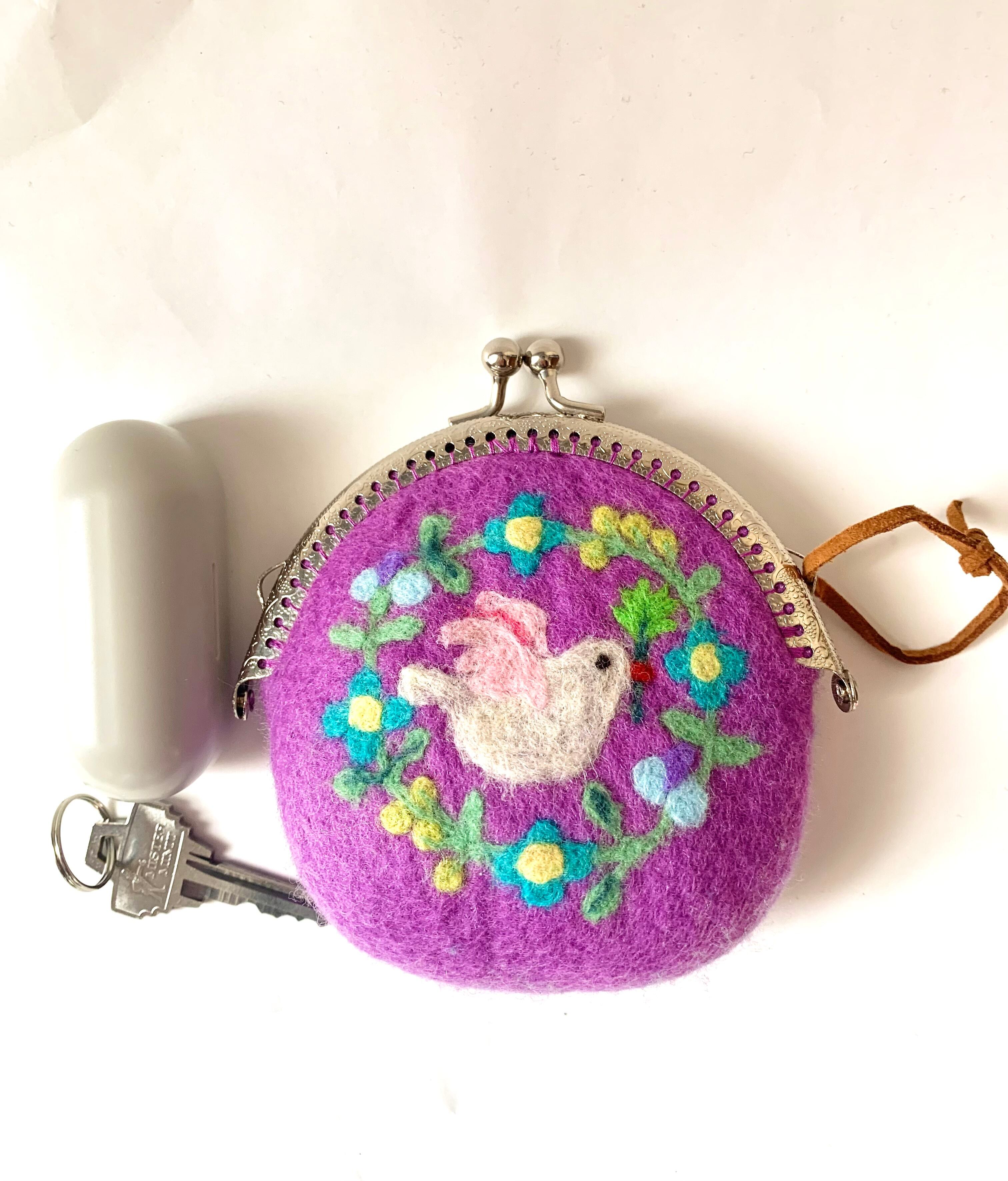 可愛らしいお花のリースと小鳥の刺繍が施されたま口が、目を引くアイテムです。