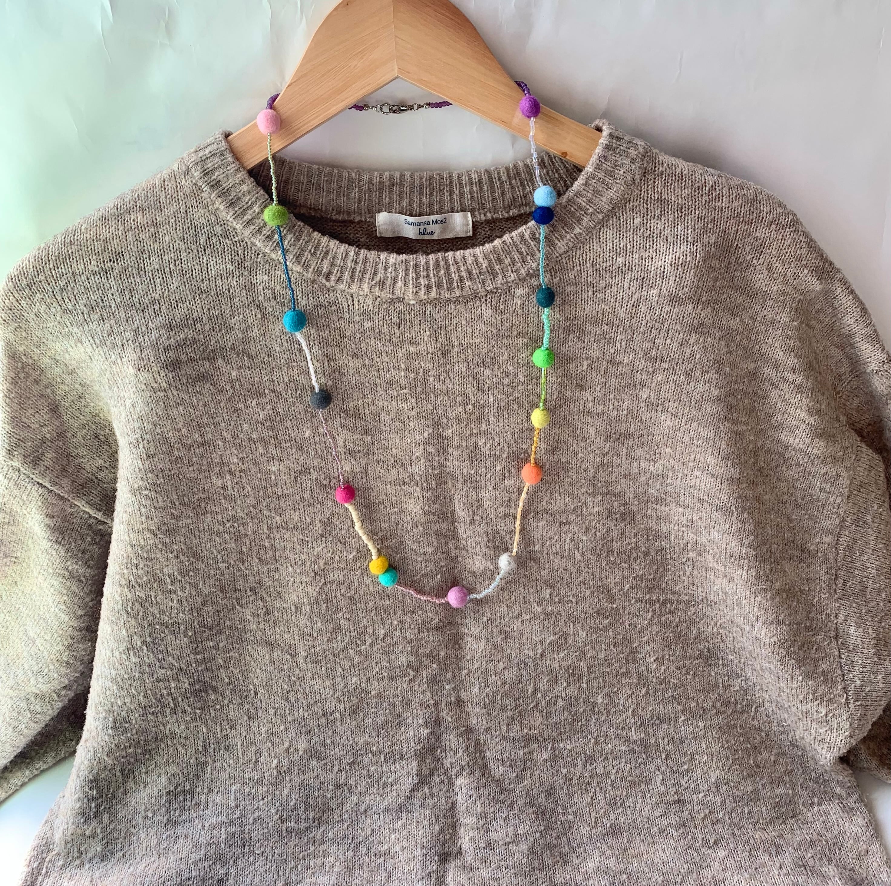羊毛フェルトボールとガラスビーズを何色もつかいカラフルだけどお洋服に馴染んじゃうアクセサリーです。